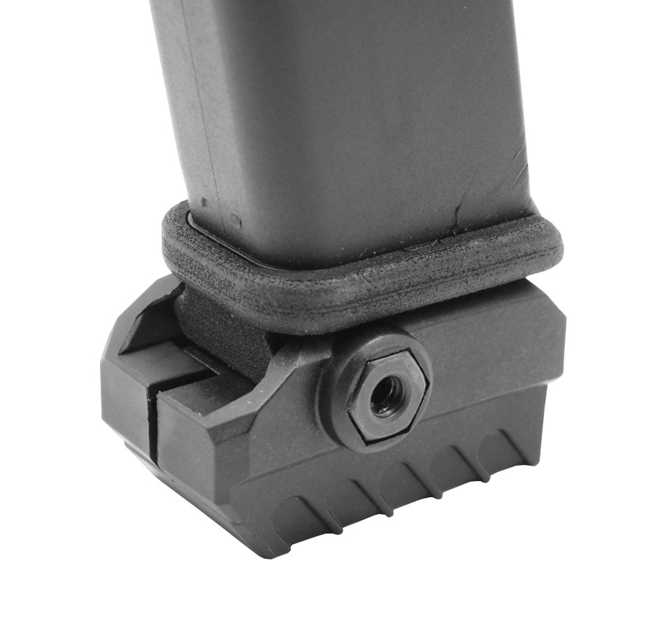 Jeśli chcesz używać trenażera strzeleckiego Mantis na broni pozbawionej szyny akcesoryjnej, warto zakupić dedykowany adapter z szyną, który umożliwia instalację urządzenia przy magazynku. Stopka Mantis z szyną dedykowana do pistoletów Glock.