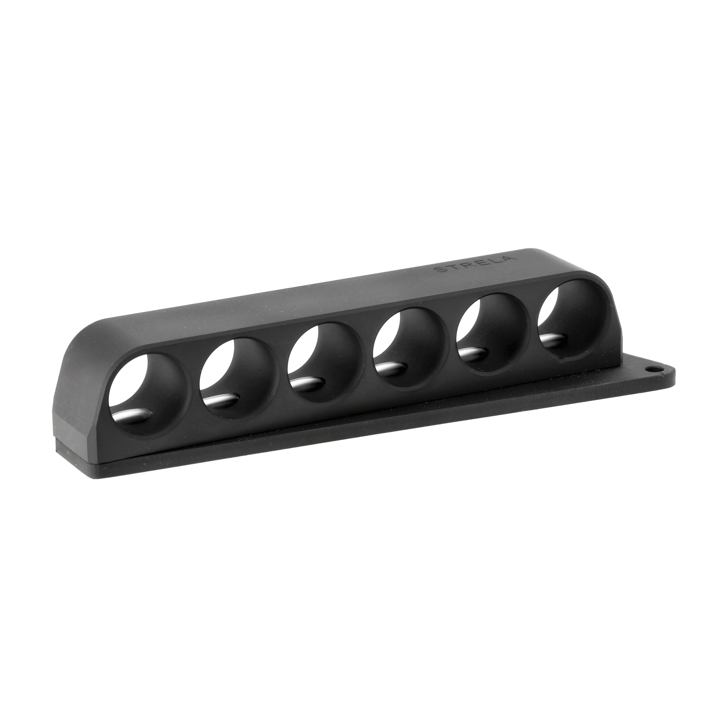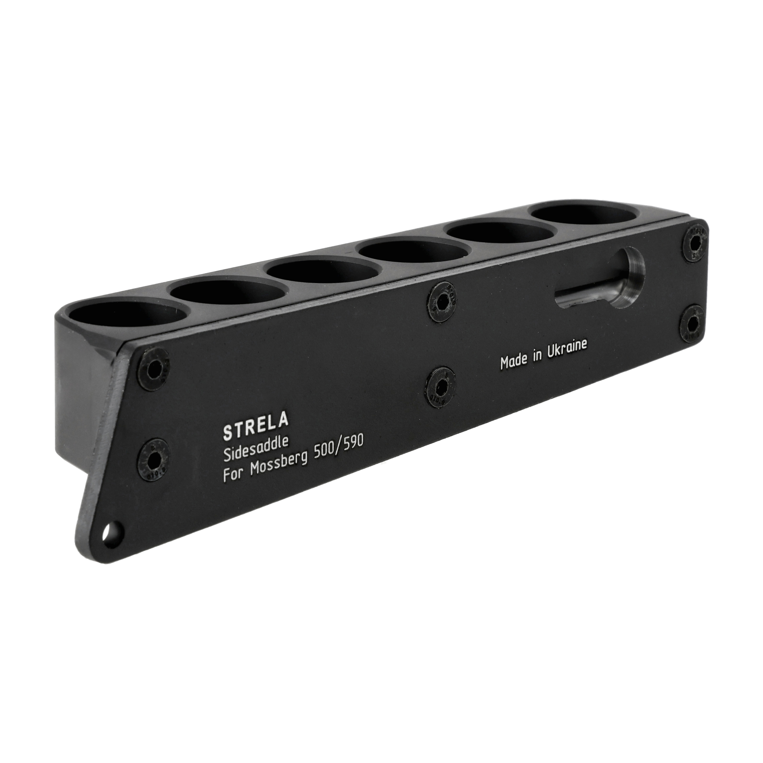 Wyprodukowany przez firmę Strela boczny uchwyt amunicyjny do strzelby Mossberg 500/590 pomieści 6 nabojów kalibru 12/76. Uchwyt wykonano z jednego kawałka aluminium D16T. Dzięki temu rozwiązaniu dodatkowa amunicja jest zawsze w zasięgu ręki. Uchwyt nie zasłania numerów seryjnych broni.