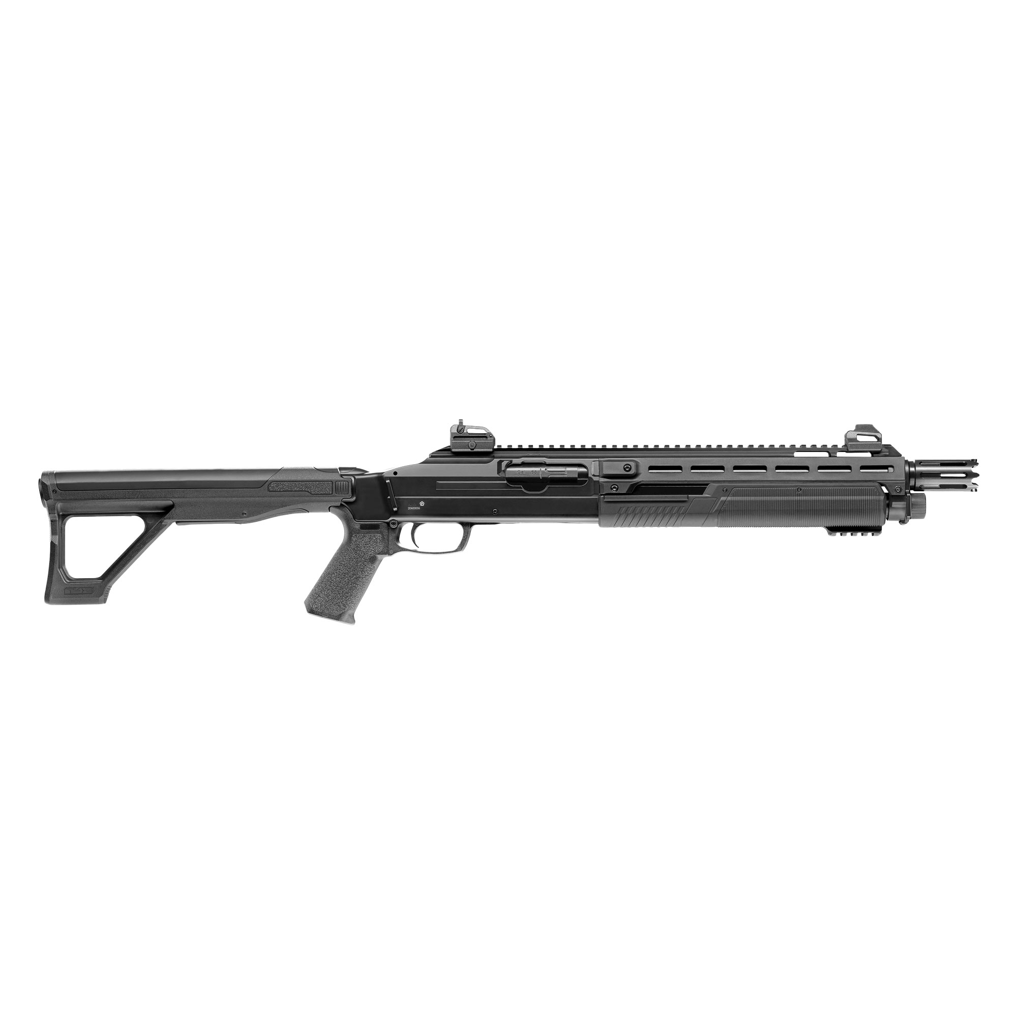 - Taktyczny wygląd i konstrukcja: konstrukcja strzelby nawiązuje do taktycznych strzelb gładkolufowych systemu pump-action, powszechnie używanych przez służby mundurowe.