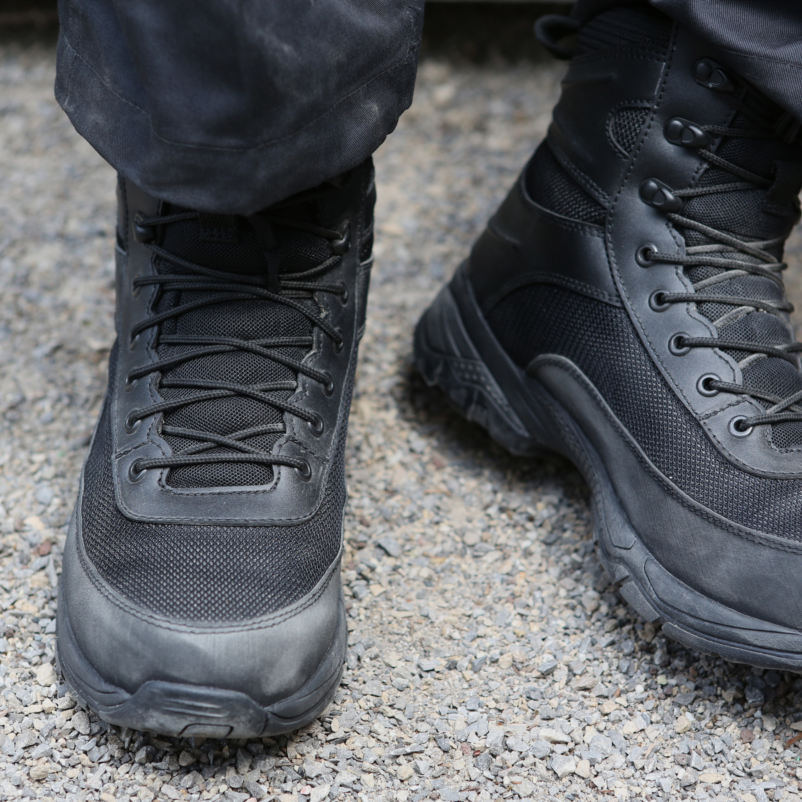 Lekkie buty taktyczne marki Brandit uszyto z wytrzymałej skóry zamszowej i siateczki nylonowej MESH – materiałów trwałych i oddychających. Składający się z ośmiu oczek system sznurowania zapewnia stopie stabilność.