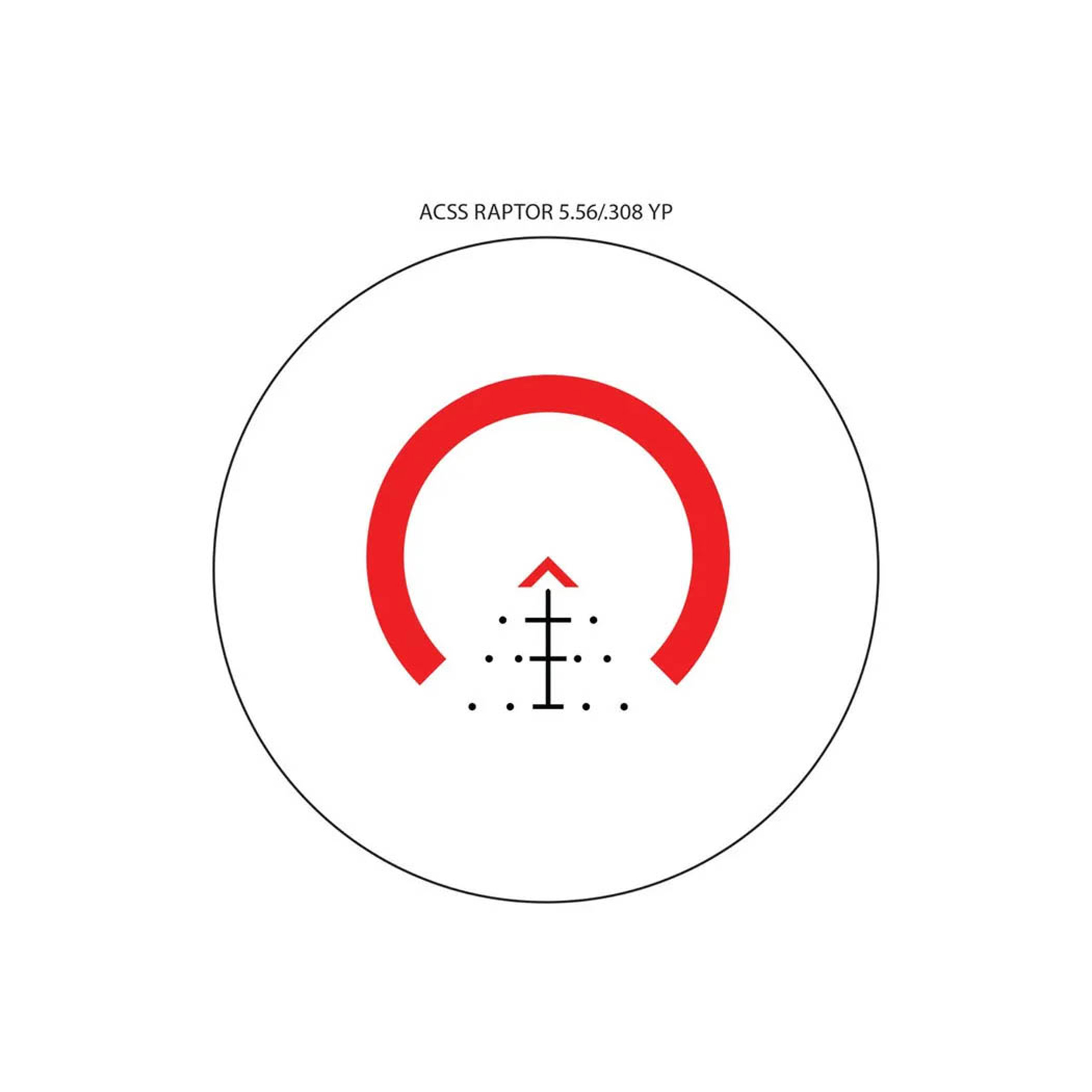 ACSS Raptor to autorska siatka Primary Arms wyskalowana do balistyki amunicji 5,56/ .308. Siatka ACSS Raptor w centralnej części ma cieńszy szewron (odwrócona litera V) otoczony grubszą podkową. Pod szewronem zamieszczono podziałkę do szacowania dystansu oraz precyzyjnego rażenia celów na różnym dystansie. W rezultacie powstała intuicyjna siatka, która świetnie sprawdzi się do strzelania dynamicznego na krótkim dystansie i precyzyjnego na średnim dystansie. ACSS to niezwykle prosty i jednocześnie funkcjonalny system celowniczy, którego zalety docenili początkujący i doświadczeni strzelcy na całym świecie. Podziałkę wyrażono w metrach, co znacząco ułatwia korzystanie z funkcji siatki celowniczej.