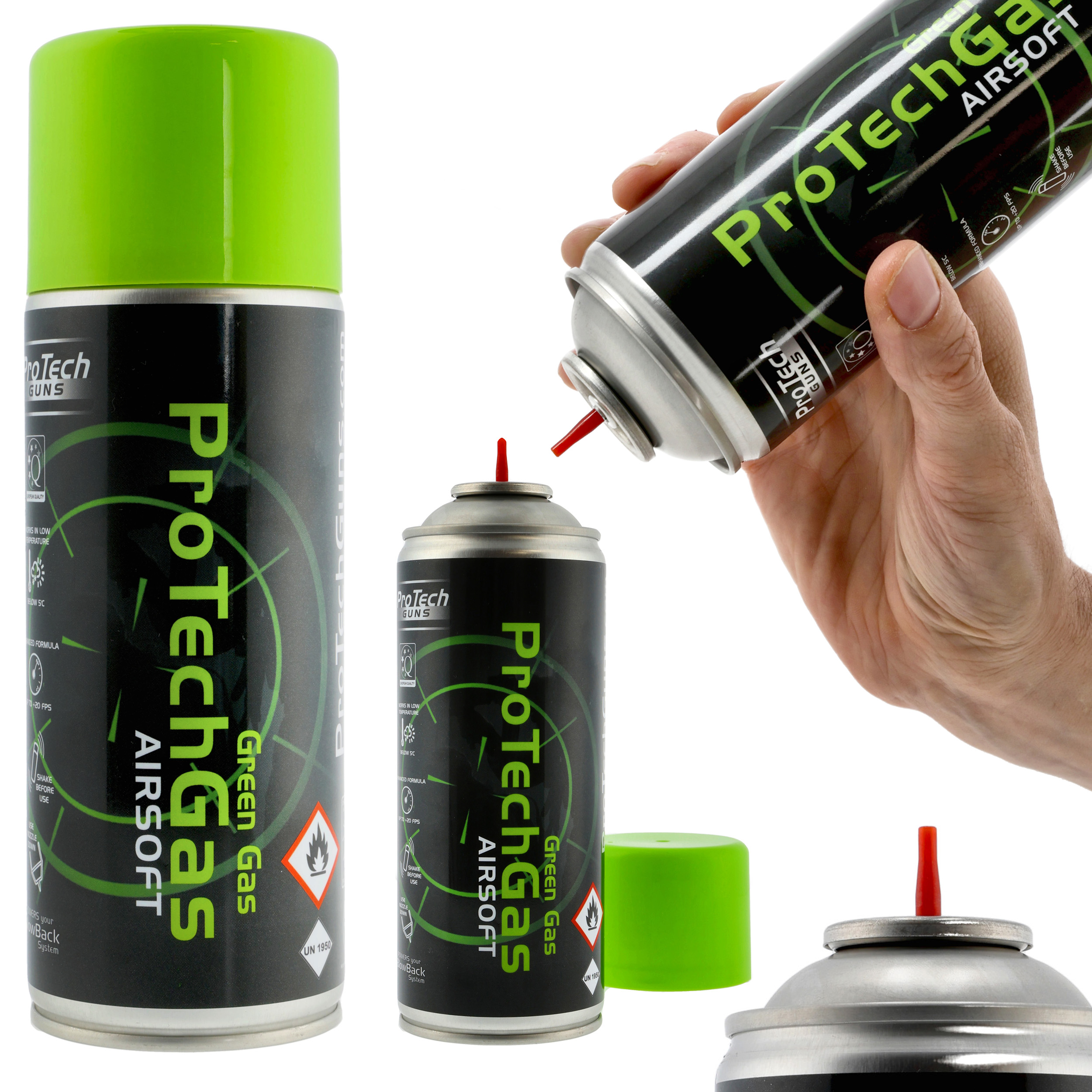 Green gas przeznaczony jest do zasilania replik ASG. Uśrednione ciśnienie pozwala na stosowanie go we wszystkich replikach, bez obawy o uszkodzenie. Zawiera olejek silikonowy który zabezpiecza i smaruje elementy  repliki.