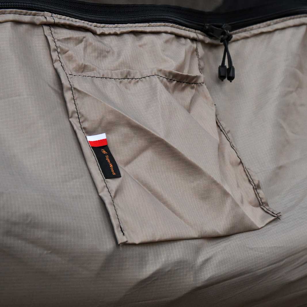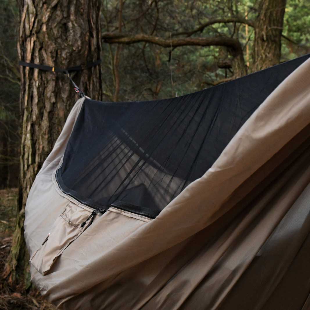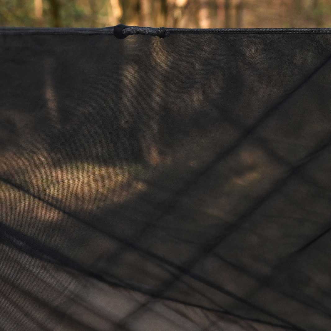 Hamak TigerWood Ważka V2 wykorzystuje wzmocnioną siatką ripstop tkaninę nylonową, gwarantującą te same korzyści wsparte zwiększoną odpornością na uszkodzenia. Materiał charakteryzuje się wysoką odpornością na rozciąganie, dzięki czemu bez problemu utrzyma ciężar do 275 kg. Charakteryzuje się przy tym niską masą oraz dobrą oddychalnością, dzięki czemu będzie komfortowy zarówno w transporcie jak i podczas użytkowania. Umieszczona na boku hamaka kieszonka umożliwi przechowanie pod ręką kluczowych akcesoriów. Zintegrowana moskitiera została natomiast wyposażona w cięciwy, które pozwalają na jej odpowiednie napięcie dla komfortu użytkownika.