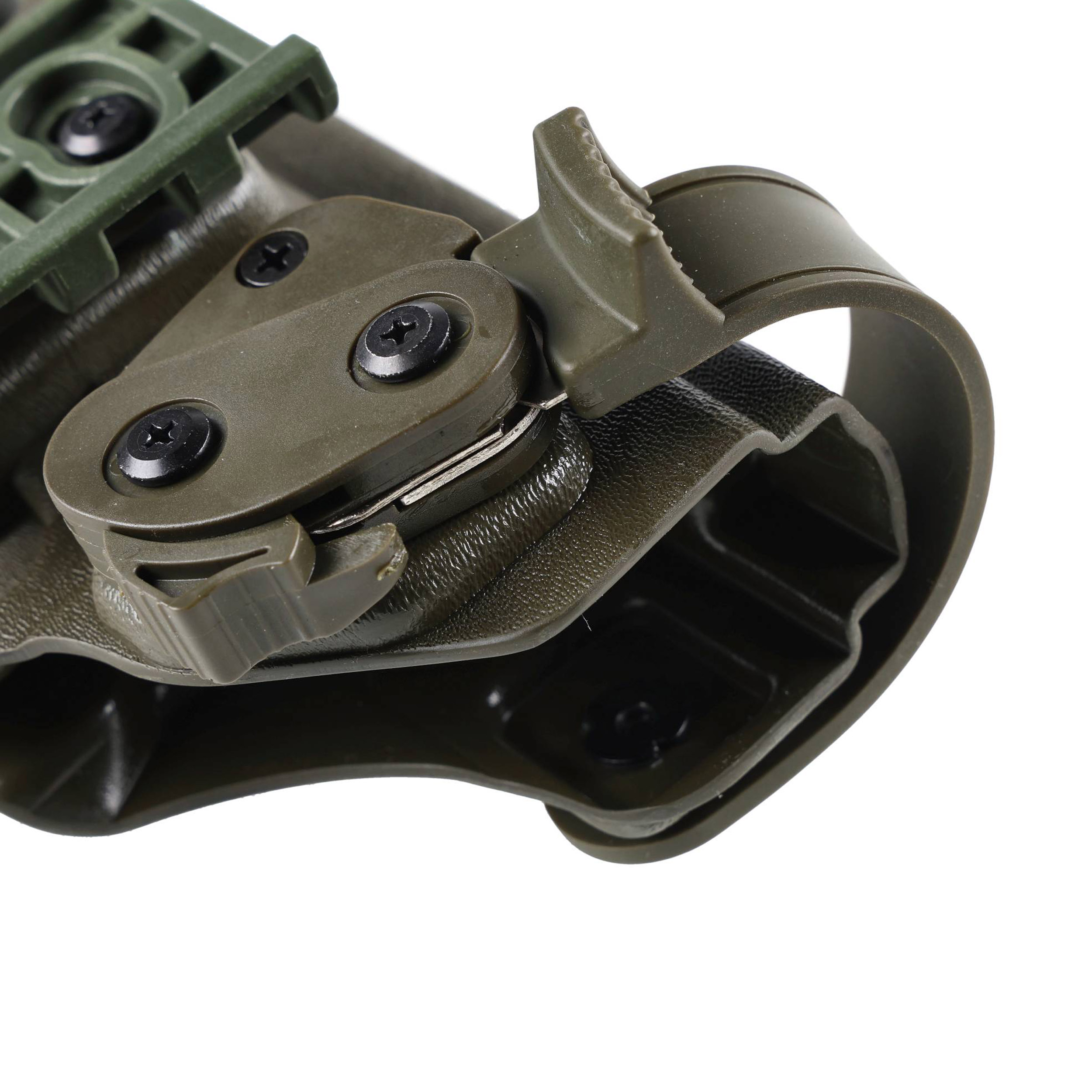 Kabura została wyposażona w zaawansowany system blokady SLS (Self Locking System), który automatycznie zabezpiecza broń po jej wsunięciu do kabury. Aby odblokować mechanizm, wystarczy jeden intuicyjny ruch – broń jest gotowa do użycia dokładnie wtedy, gdy tego potrzebujesz, ale bez ryzyka przypadkowego wysunięcia. Regulowana retencja przy kabłąku spustowym pozwala idealnie dopasować siłę blokowania kabury do własnych preferencji.