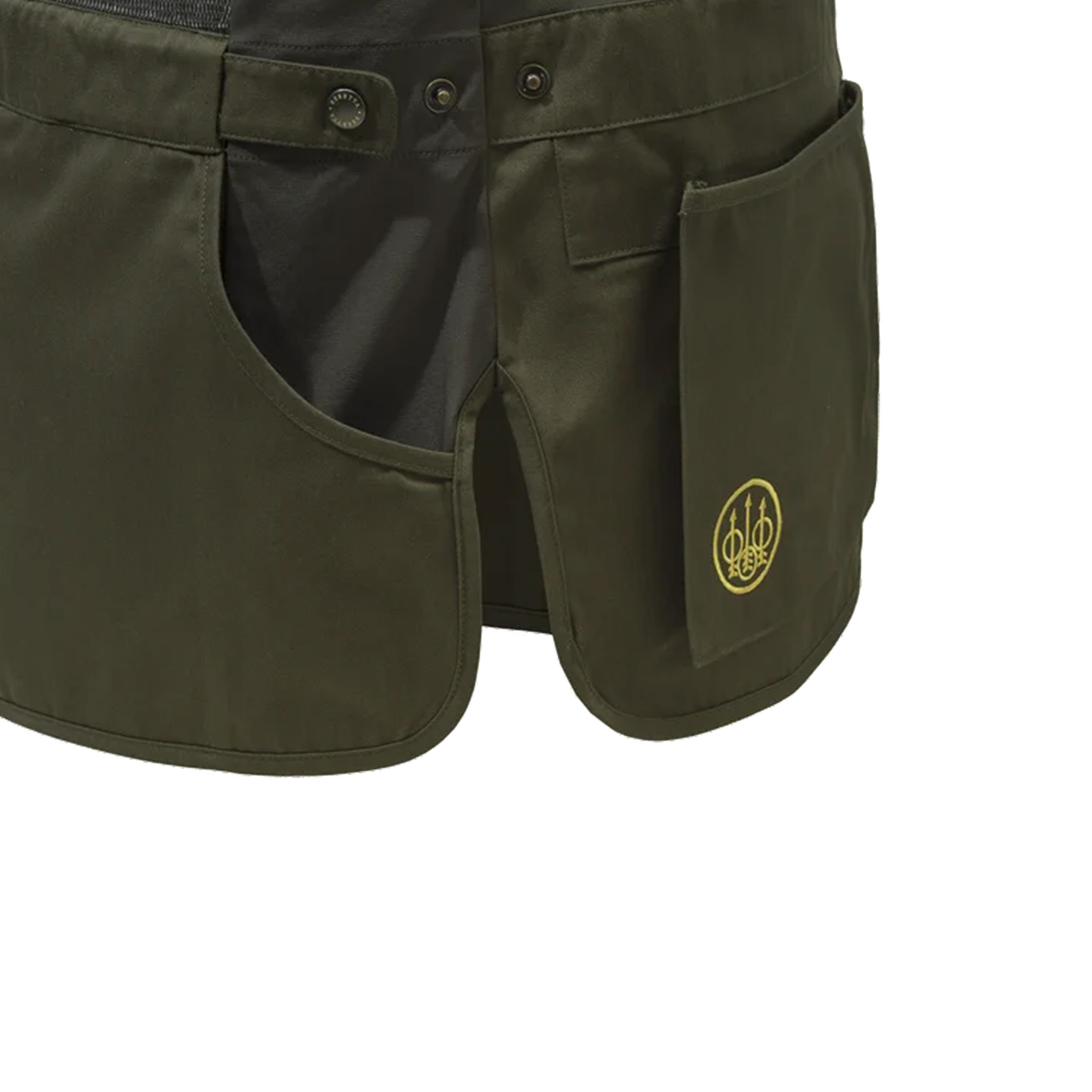 Przedni panel z trwałej tkaniny bawełnianej pokrytej pikowaniem zapewnia stabilność przy wsparciu kolby broni, oraz odpowiednią wytrzymałość dla długotrwałego użytkowania. Ponadto kamizelka wyposażona jest w przednie kieszenie na amunicję oraz zawieszki na ochronniki słuchu czy rękawice, co pozwala na szybki dostęp do niezbędnych akcesoriów podczas polowania.