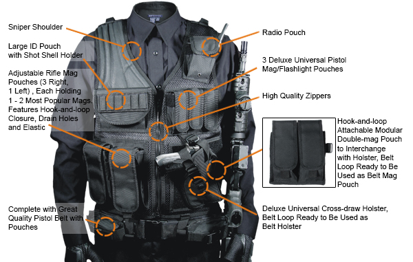 Duży zakres regulacji pozwala na dopasowanie rozmiaru kamizelki do wzrostu i postury użytkownika. Dzięki sporej ilości kieszeni kamizelka pozwala na indywidualną organizację wyposażenia i magazynków.