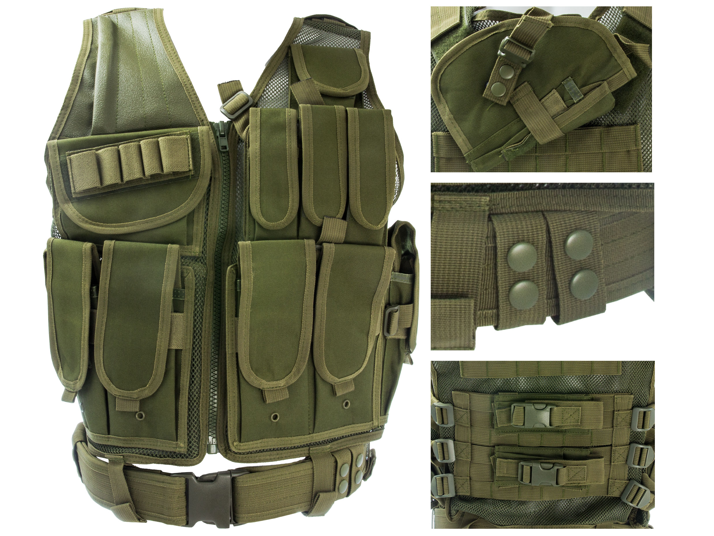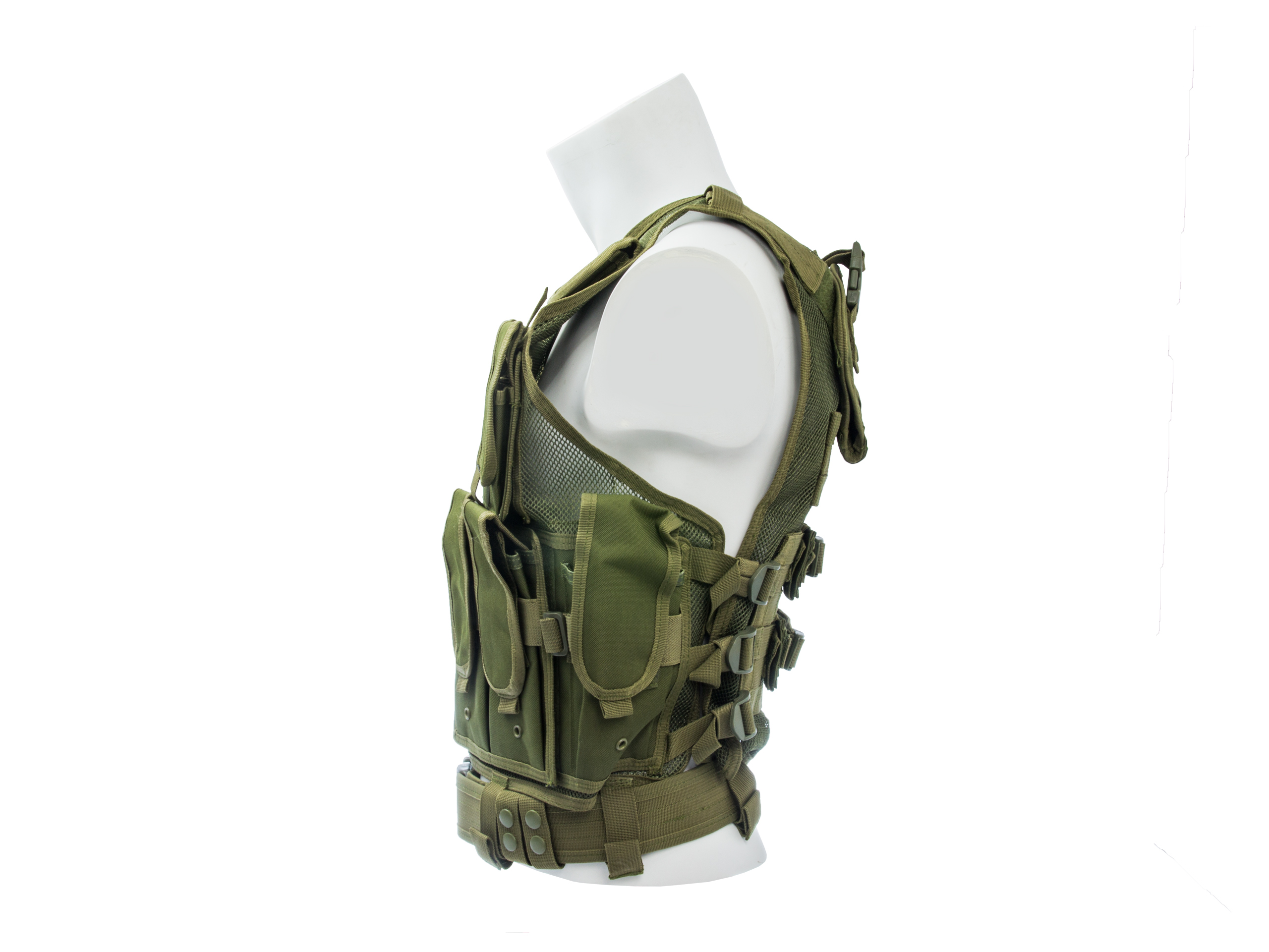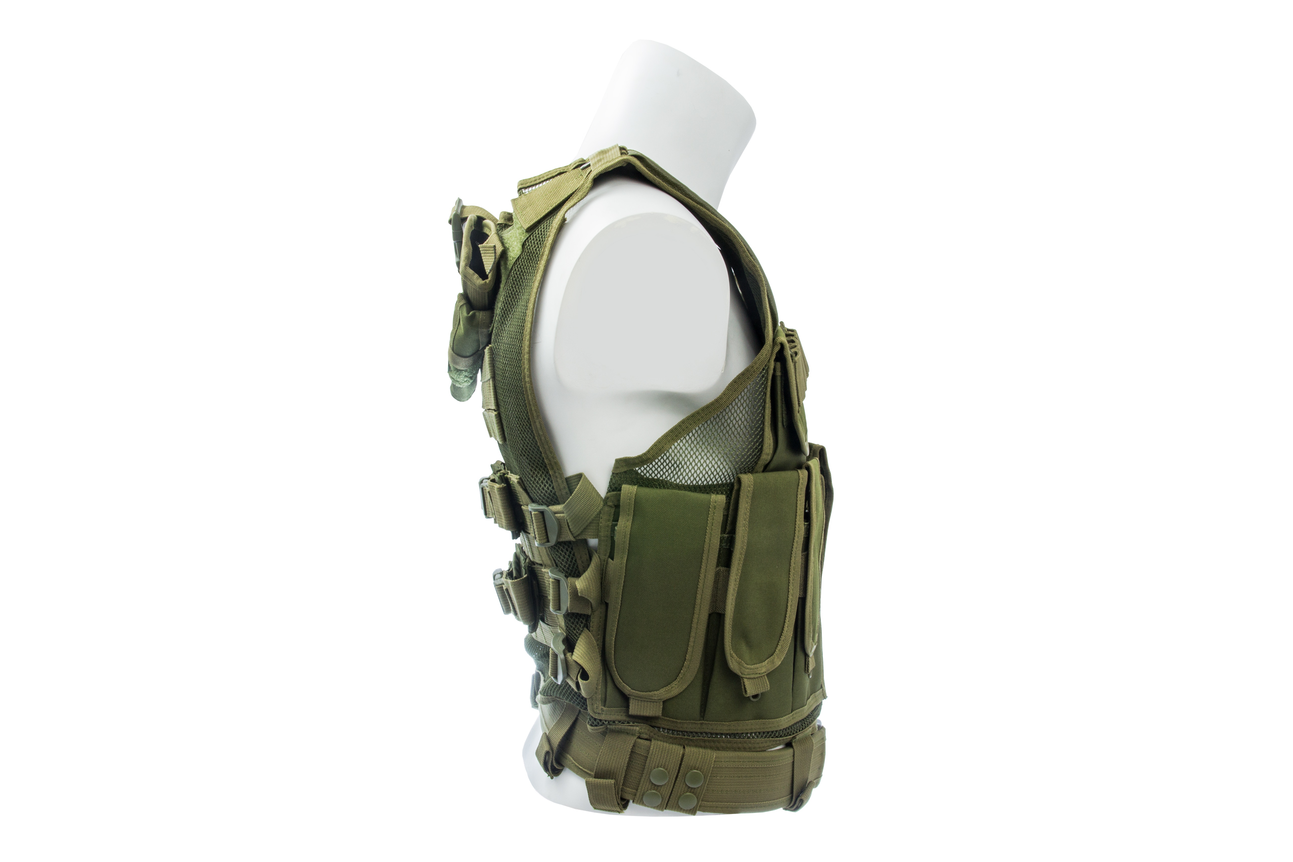 Dzięki podszyciom taśmy valcro jesteśmy w stanie dopasować układ ładownic, kieszeni pod własne potrzeby. Uniwersalna kabura w kamizelce będzie pasowała do większości pistoletów. Tył kamizelki został wykonany w systemie molle dzięki czemu możemy dopiąć dodatkowy ekwipunek. Kamizelka dostępna w kolorze oliwkowym.