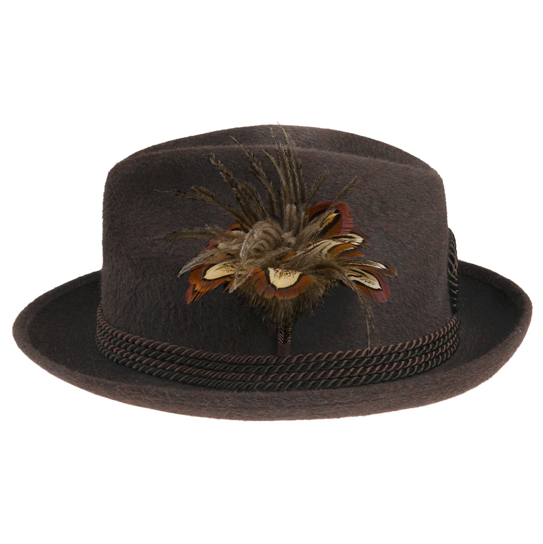 Kapelusz posiada wąskie, zawadiacko wywinięte rondo, chroniące przed deszczem. Oddychający filc gwarantuje dobrą cyrkulację powietrza oraz doskonałe dopasowanie. Koronę kapelusza ozdobiono otokiem z zaplecionych sznurków oraz splecionymi ptasimi piórami.