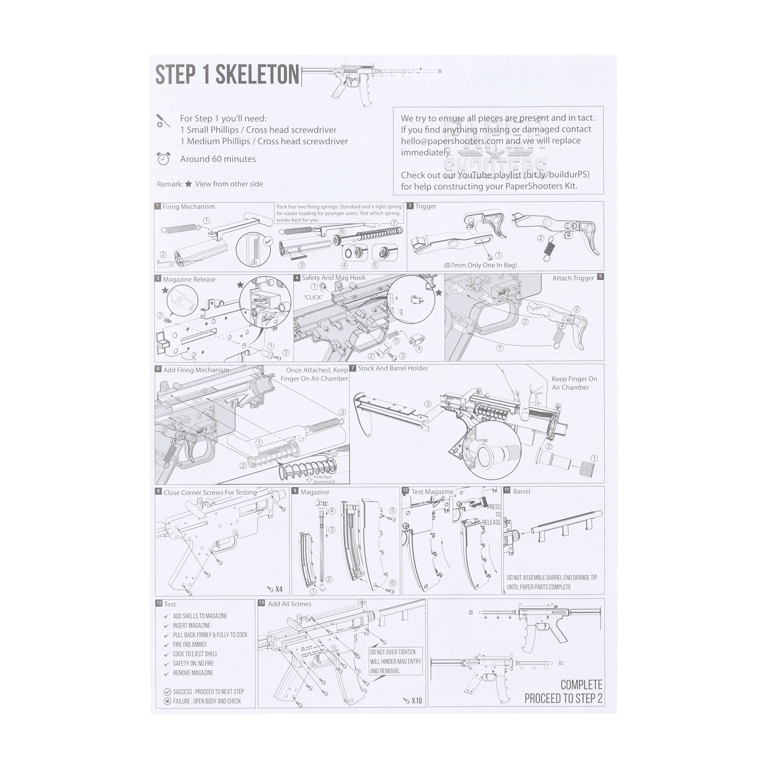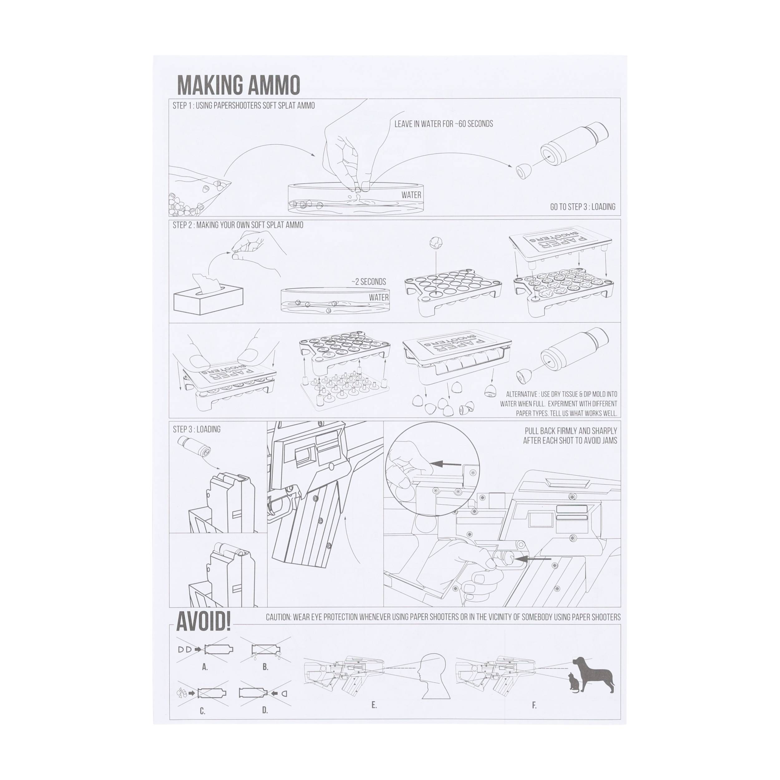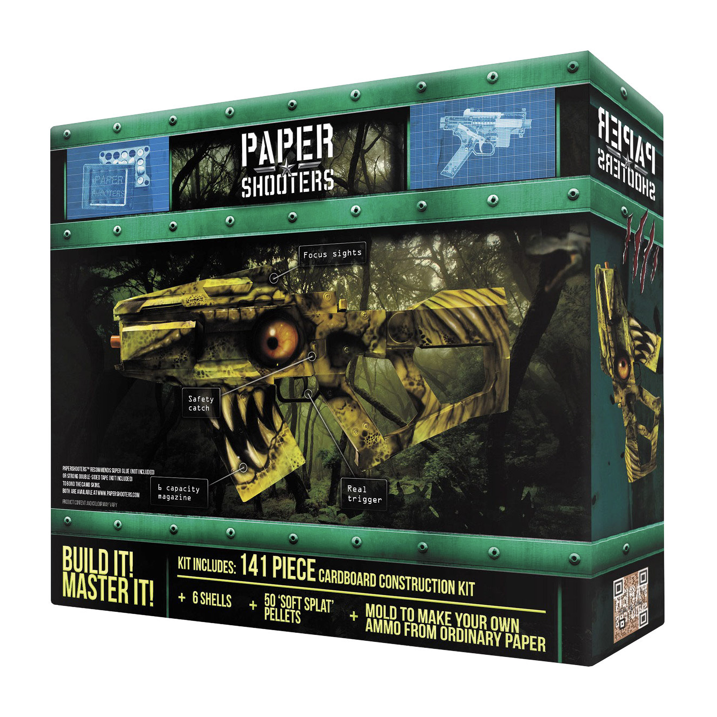 Karabin Paper Shooters Green Spit jest wykonany z polimeru oraz elementów kartonowych, które przy użyciu kleju możemy łączyć i modyfikować, nadając zabawce ostateczną formę. Model wykorzystuje magazynki oraz atrapy łusek dla zwiększenia realizmu, i wymaga każdorazowego przeładowania w celu ekstrakcji łuski.