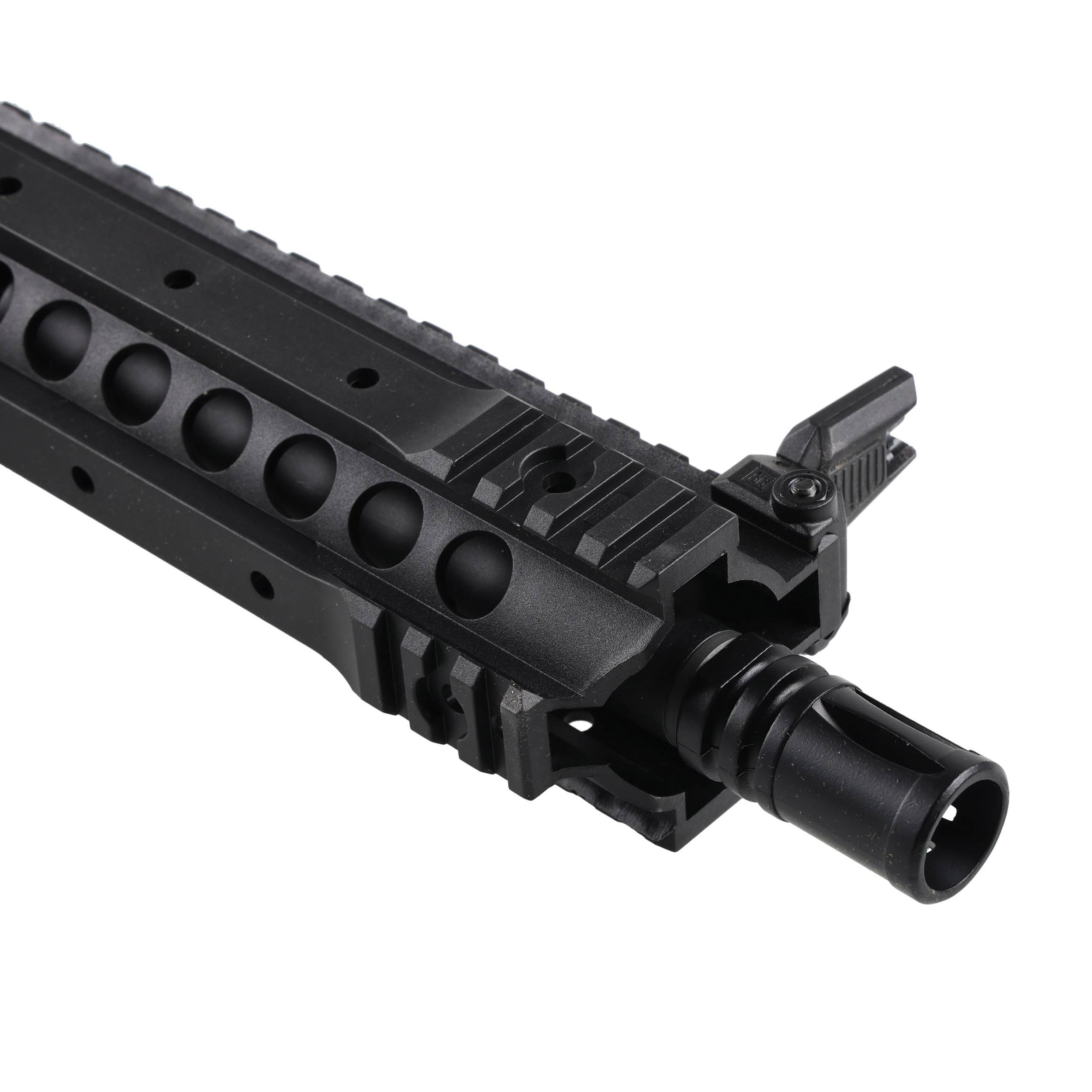 Tłumik płomienia zamocowano na 14-mm lewoskrętnym gwincie, co zwiększa jego kompatybilność z dodatkowymi akcesoriami.