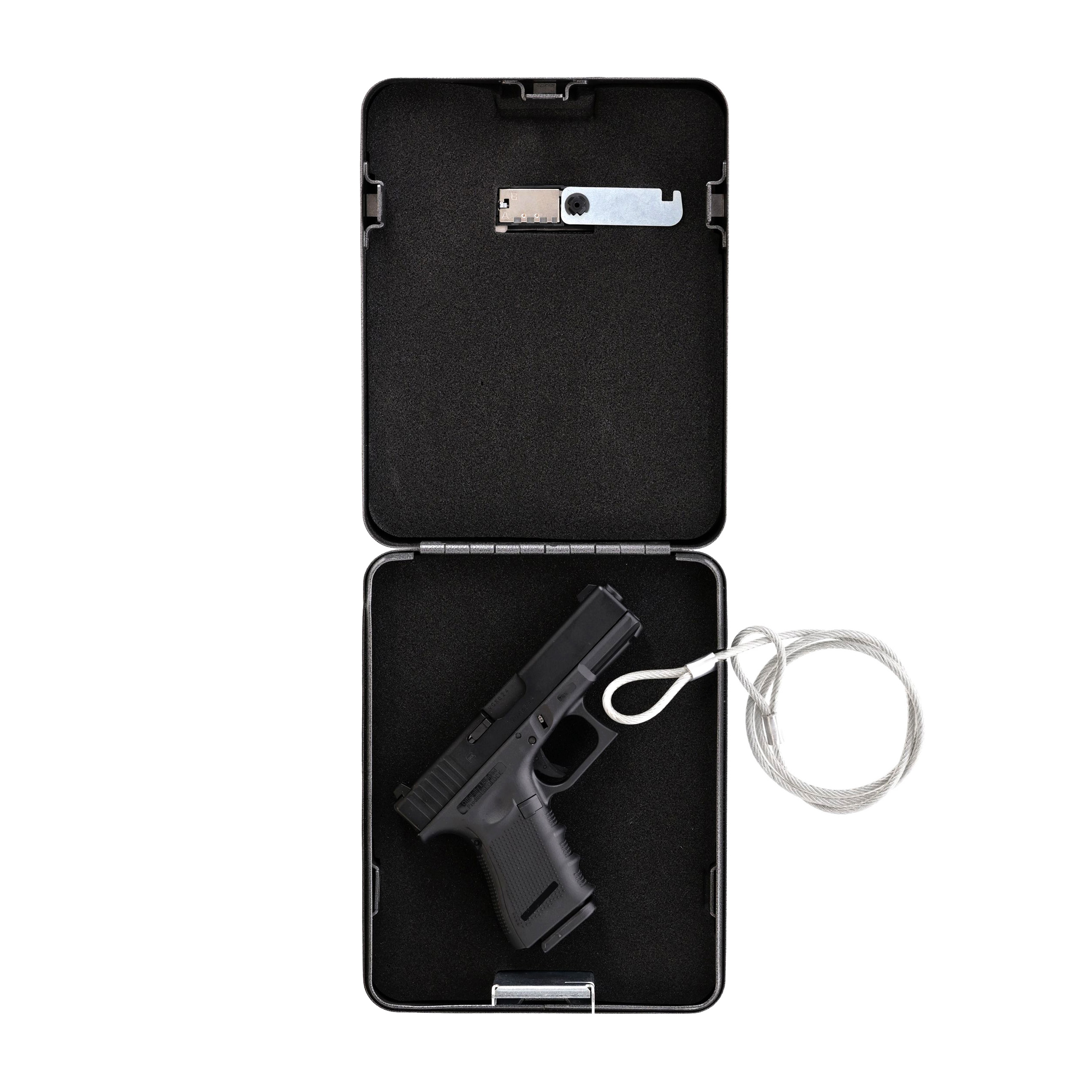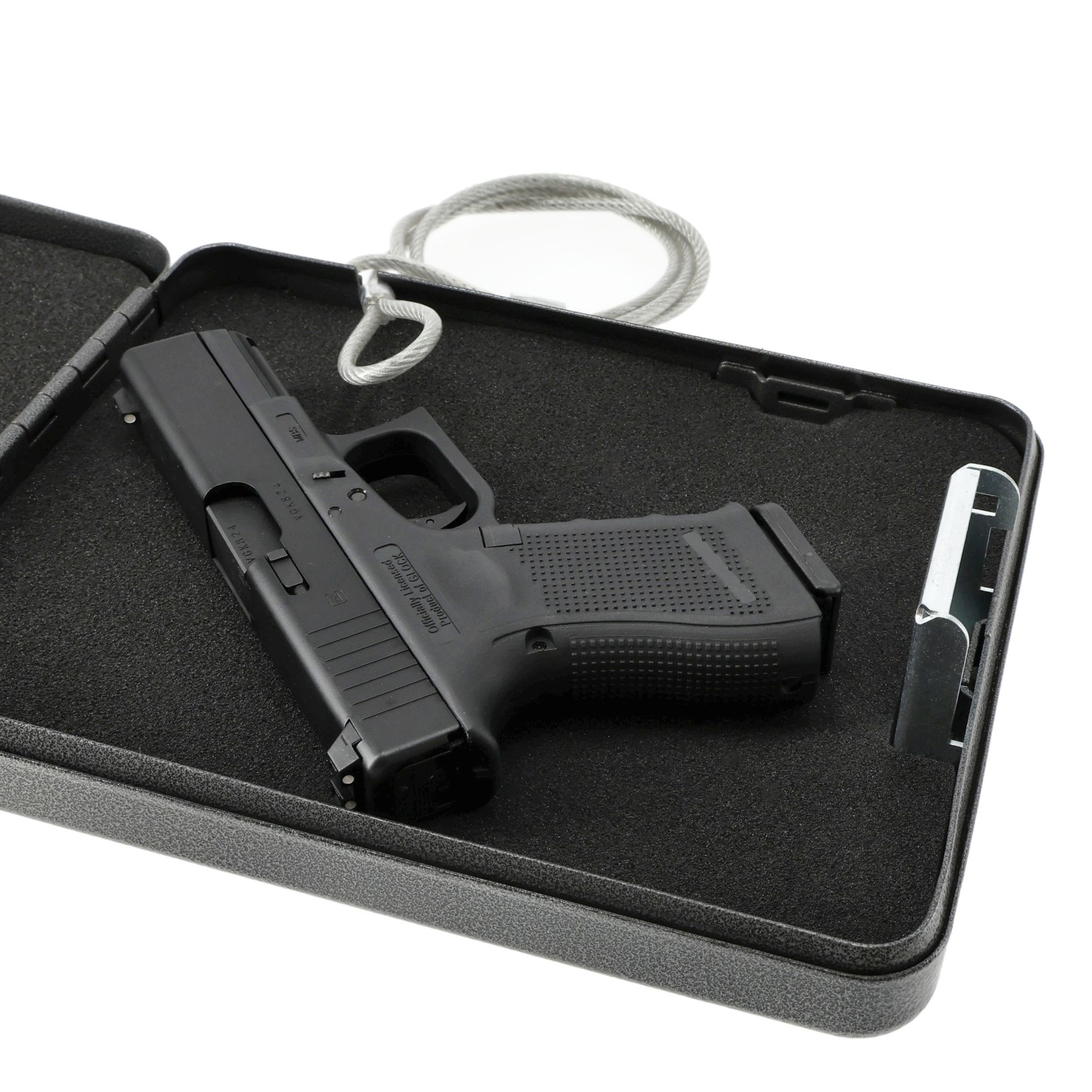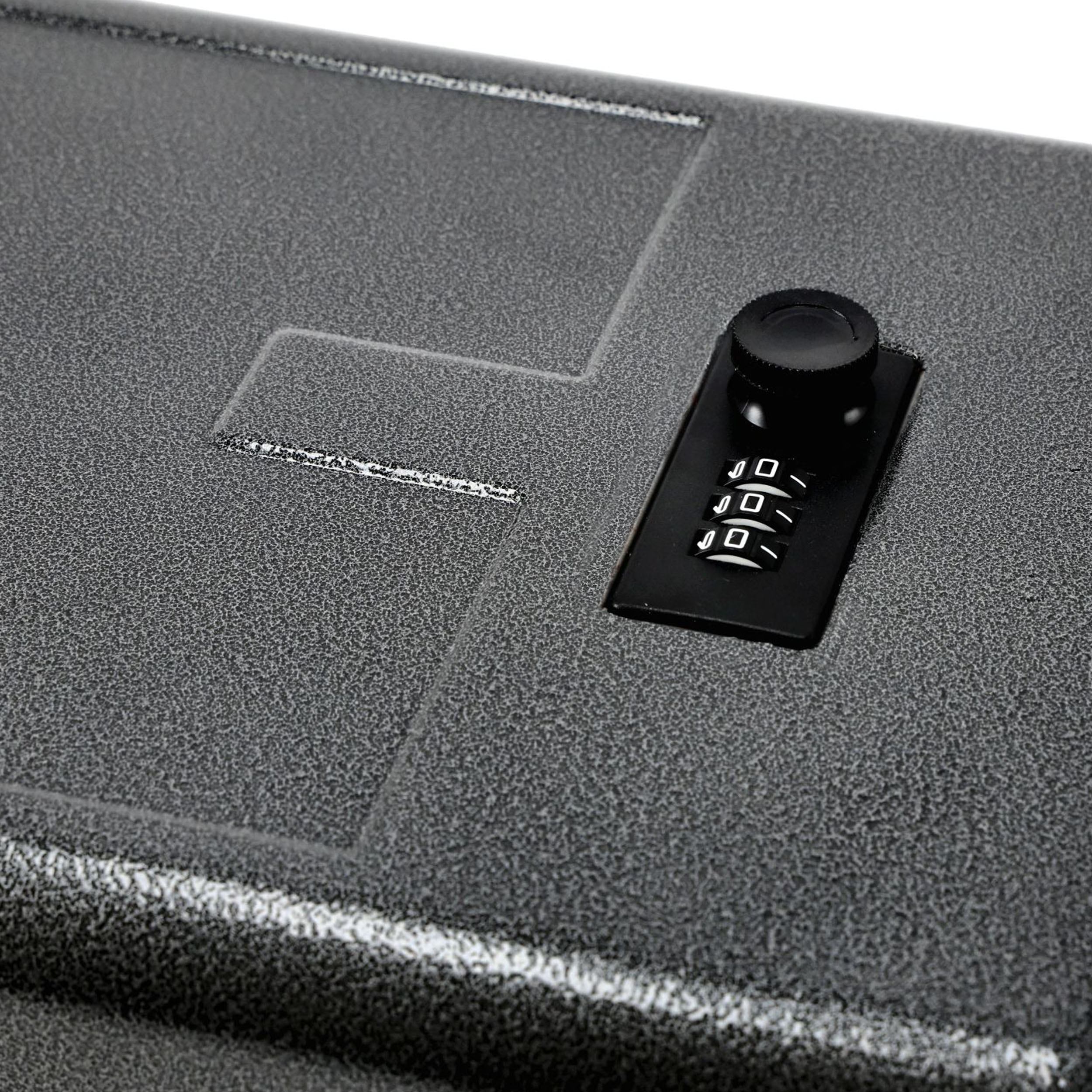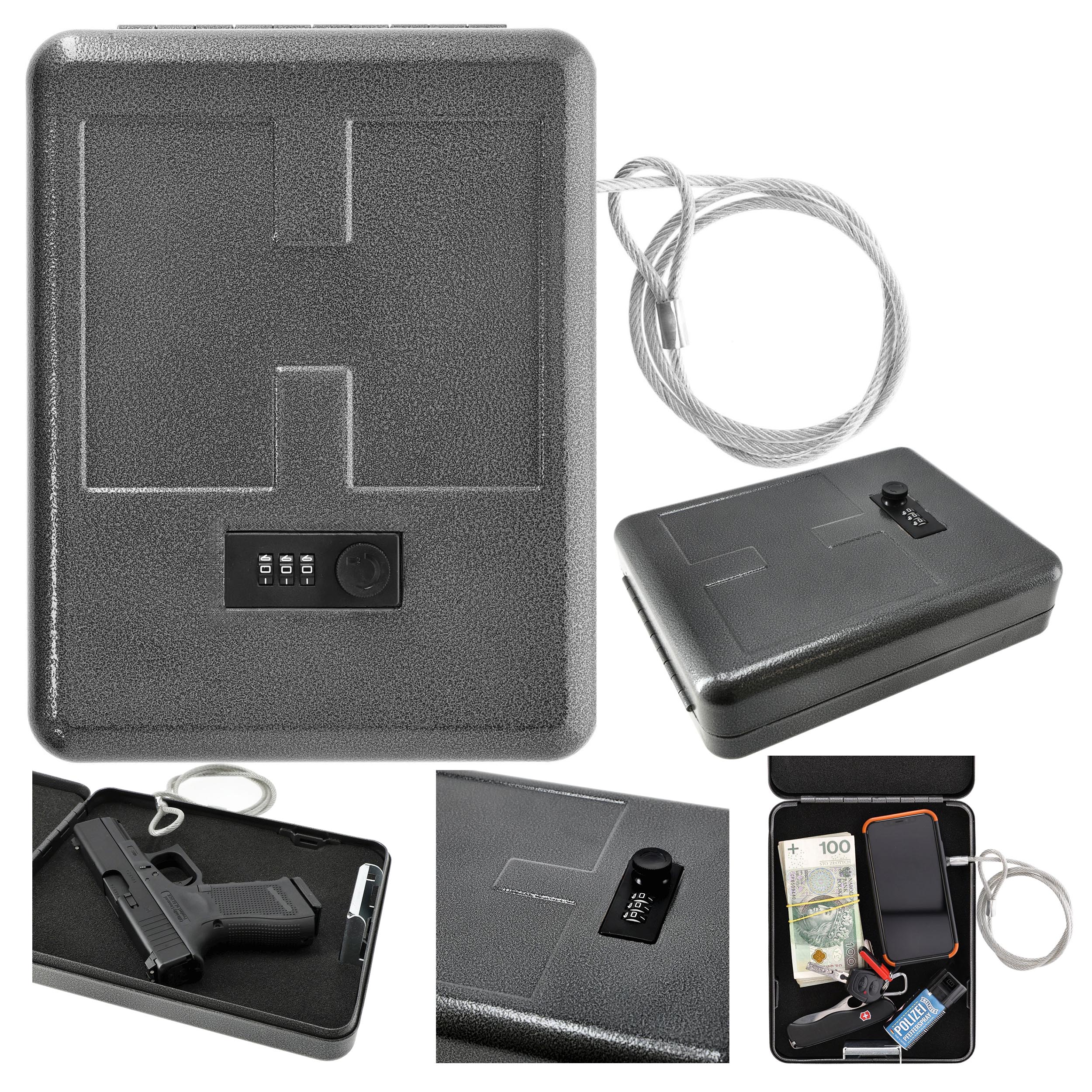 Umarex Safety Box L zamykana jest za pomocą zamka szyfrowego z 3-cyfrowym kodem dostępu. Mini sejf ma również stalową linkę o długości ok. 90 cm, która pozwala na zamocowanie kasety do elementów zabudowy i zabezpieczenie jej przed kradzieżą.