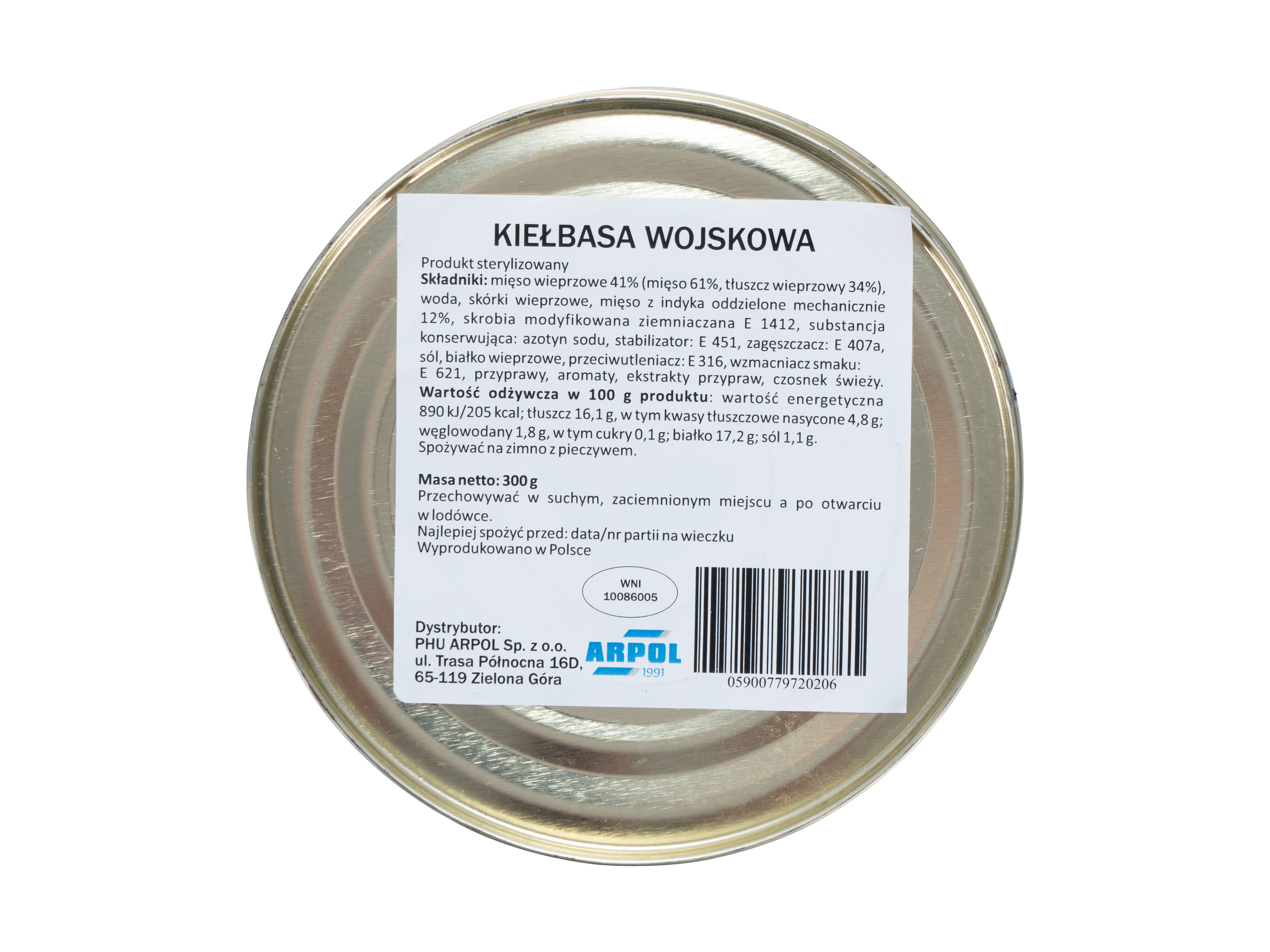 Kiełbasa wojskowa Arpol 300 g to wojskowa konserwa mięsna o niezapomnianym smaku, idealna do spożywania na zimno z pieczywem i sucharami.