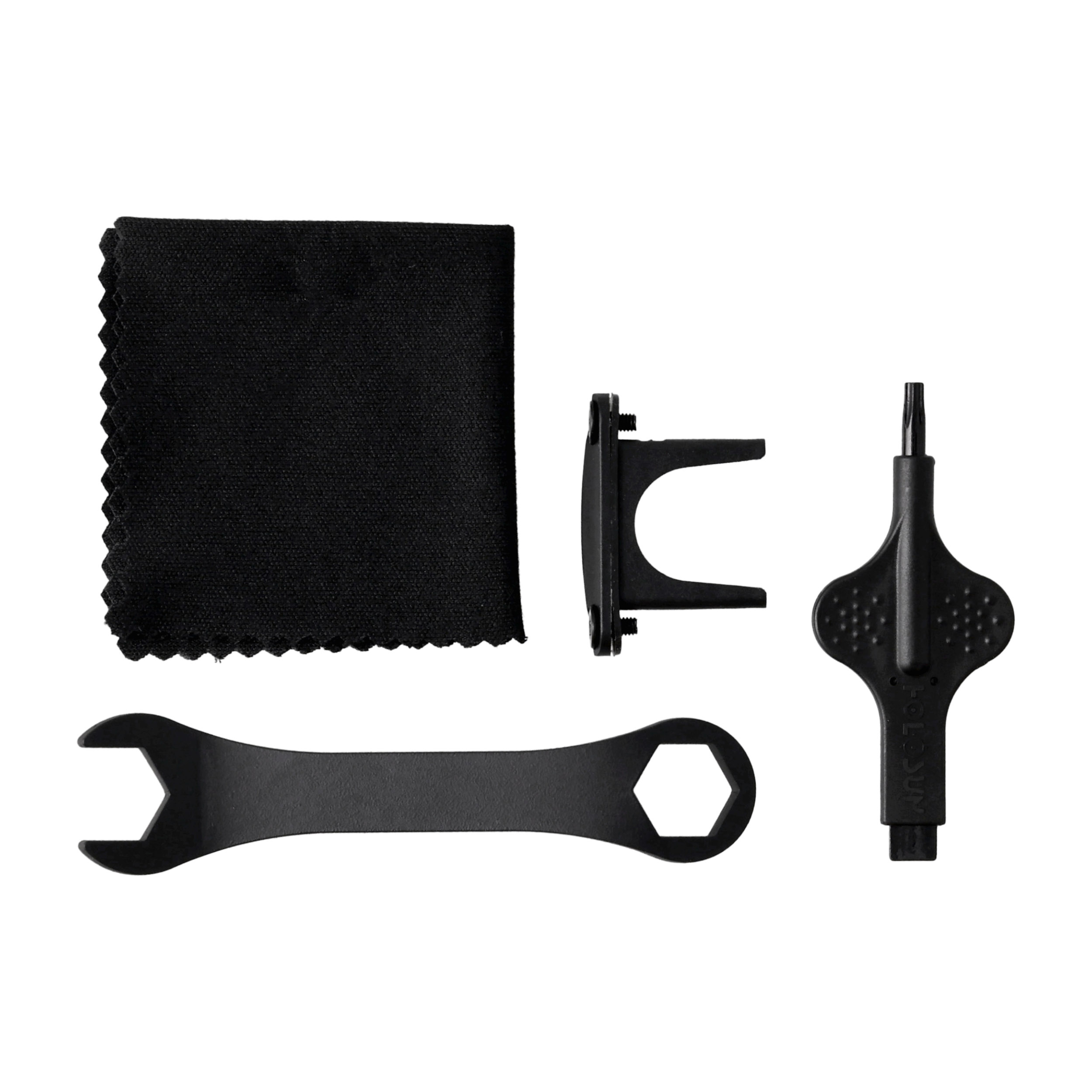 Elementy zestawu kolimatora: narzędzie wielofunkcyjne, montaż 1/3 Co-Witness, ściereczka do czyszczenia optyki, kolimator