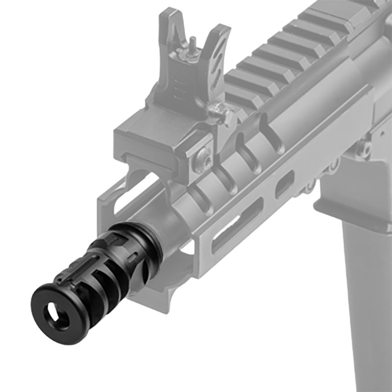 UTG PRO AR15 Stubby Muzzle Brake 9 mm to kompaktowy hamulec wylotowy do karabinka pcc 9 mm, który skutecznie ogranicza odrzut i podrzut broni. Urządzenie w wersji skróconej.