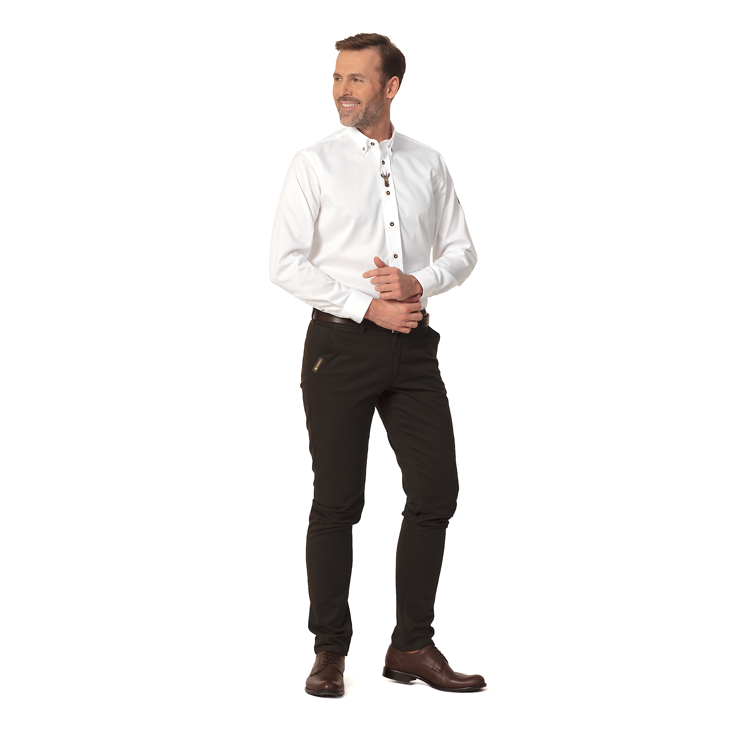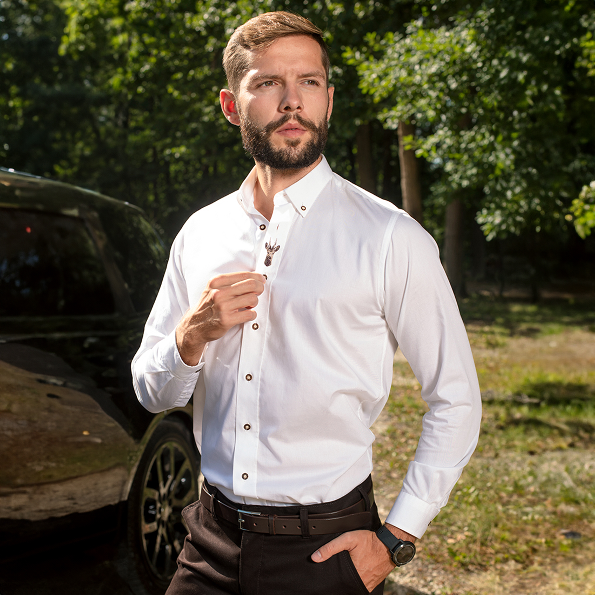 Koszula bawełniana Tagart – biała z koziołkiem to męska i elegancka koszula wyjściowa w klasycznej stylistyce. Sprawdzi się nie tylko na różnorodne okoliczności, ale również do codziennego noszenia. Nadaje się pod marynarkę, sweter czy bluzę. Wykonano ją ze 100% bawełny, dzięki czemu jest miła w dotyku, miękka i przewiewna. Na materiał naniesiony został nadruk przedstawiający głowę samca sarny – kozła. Biała kolorystyka ta ułatwi dopasowanie okrycia wierzchniego do koszuli, a motyw zwierzęcy z pewnością przypadnie do gustu pasjonatom myślistwa. Przedstawiony model ma swobodny, luźny krój.