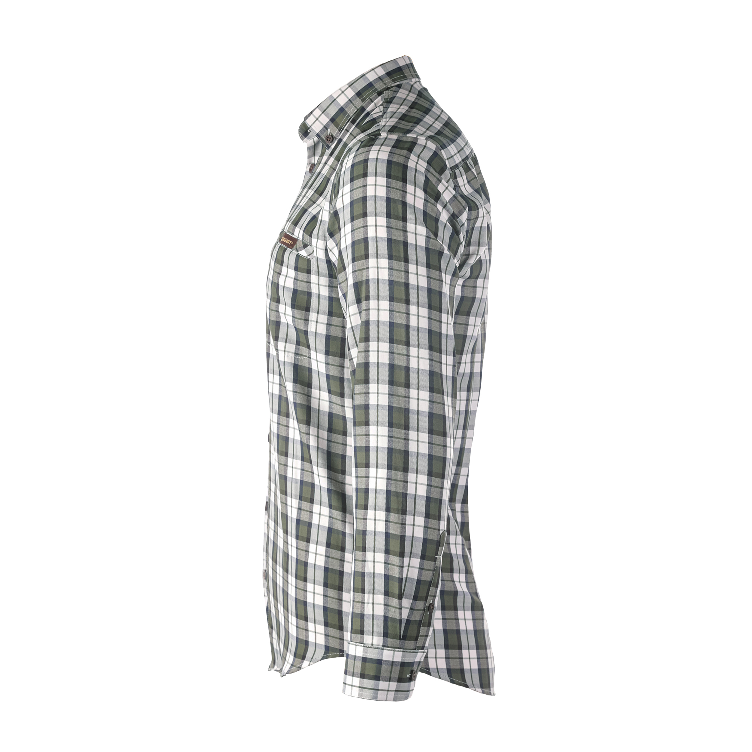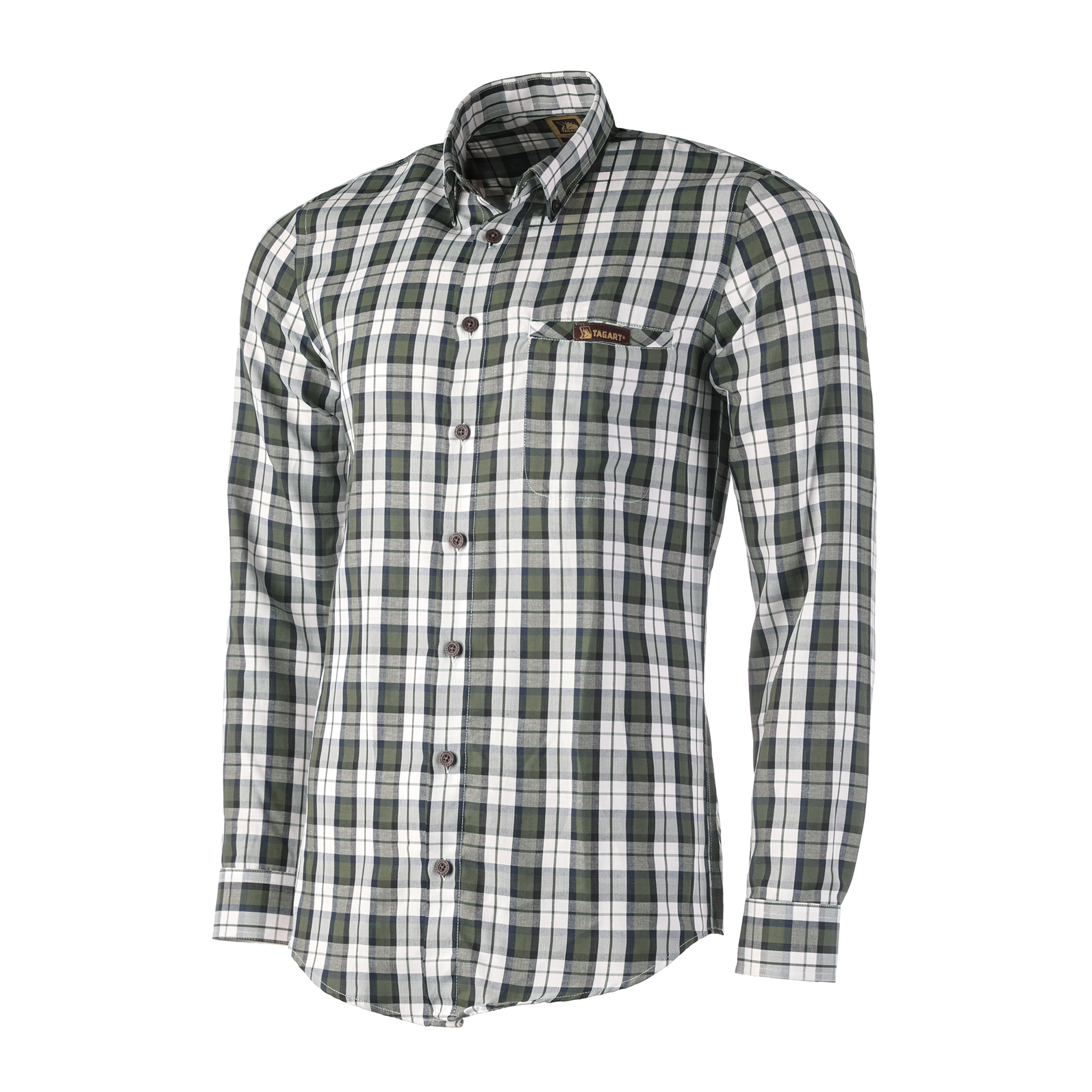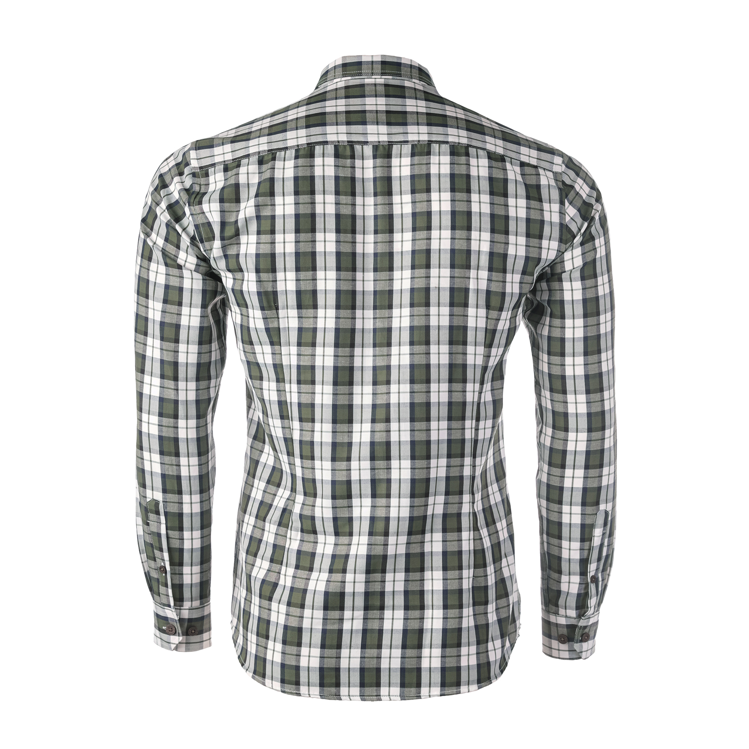 Wykonana głównie z wysokiej jakości bawełny z domieszką poliestru, oferuje wyjątkową miękkość i przewiewność, a dodatek poliestru sprawia, że jest wytrzymała, łatwa w pielęgnacji i prasowaniu. Charakterystycznym elementem koszuli jest średniej wielkości krata w odcieniach ciemnozielonego, granatowego i białego, nadająca jej wyrazisty, elegancki wygląd.
