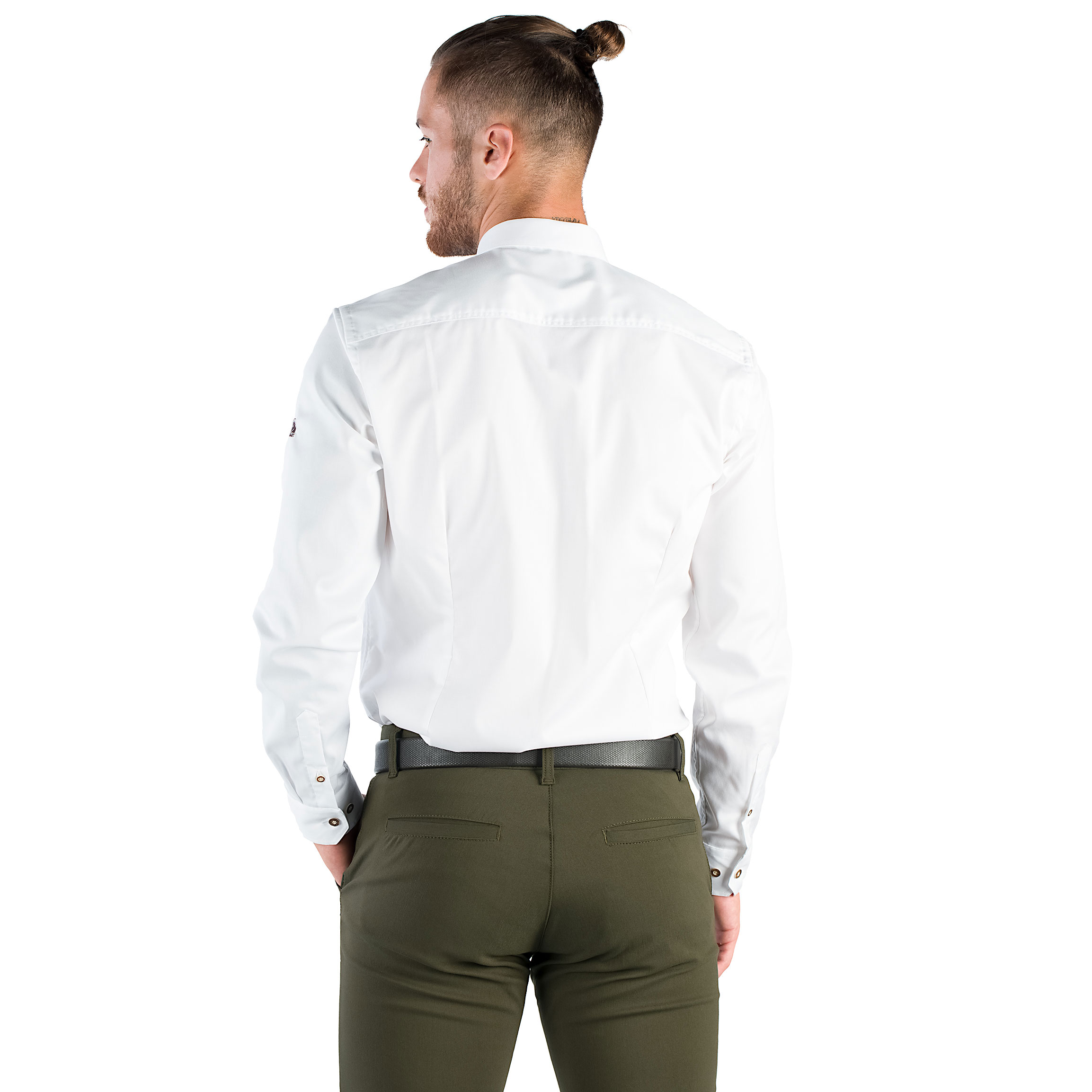 Na lewej piersi zlokalizowana jest zapinana na guzik kieszeń, w której bezpiecznie przechowasz drobiazgi. Koszula wyposażona została w brązowe guziki z imitacją poroża, kontrastujące z bielą koszuli. Ponadczasowy wygląd koszuli sprawia, że idealnie sprawdzi się do garnituru, ale także w stylizacji z jeansami i marynarką.
