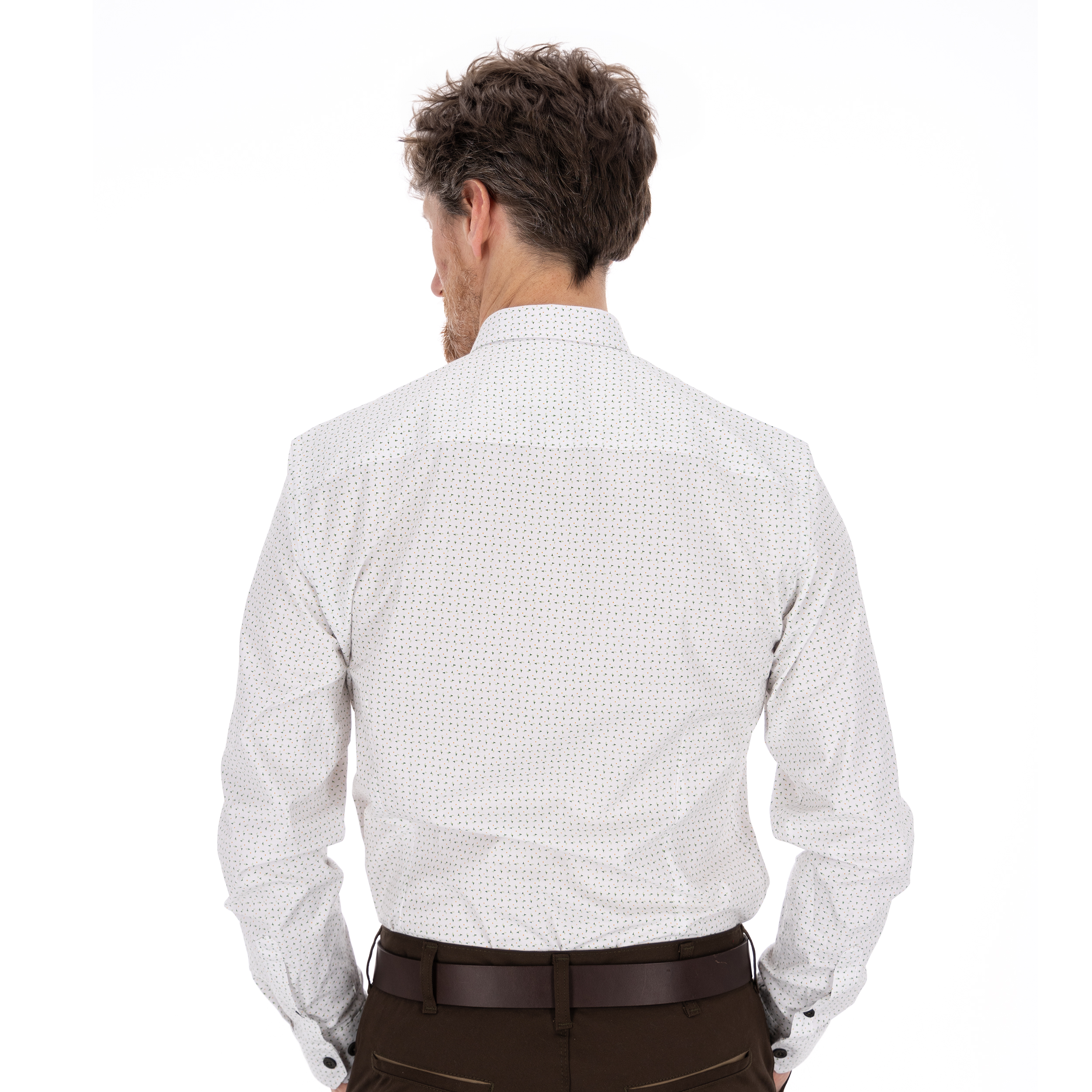 Koszula charakteryzuje się subtelnym wzorem, który dodaje jej lekkości i oryginalności, zachowując przy tym formalny wygląd. Kontrastujące guziki wyróżniają się na tle materiału, podkreślając staranne wykończenie. Na lewej piersi znajduje się delikatne logo Tagart, które dodaje koszuli eleganckiego akcentu. Dopasowany fason slim fit podkreśla męską sylwetkę, a dodatek elastanu zapewnia pełen komfort i swobodę ruchów.
