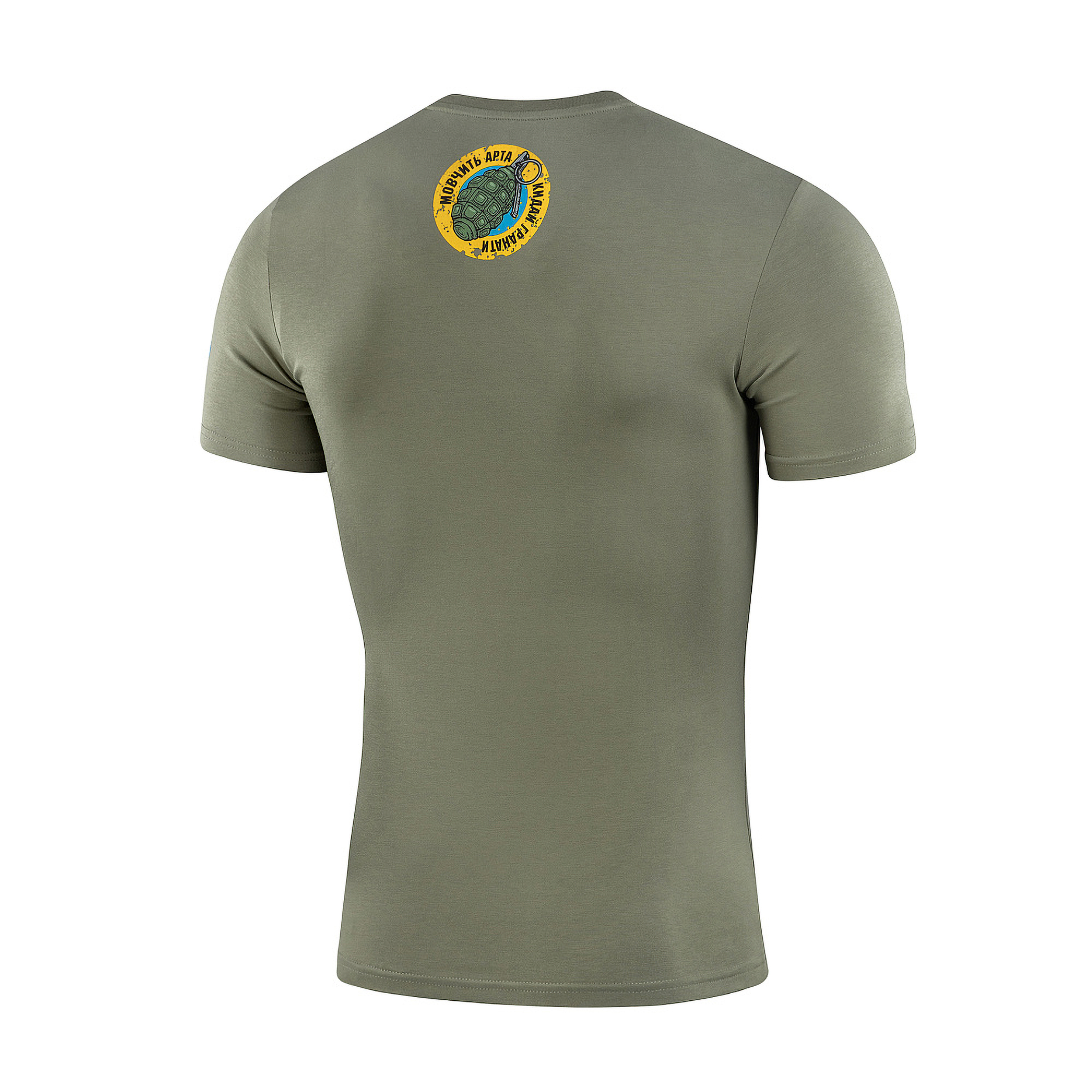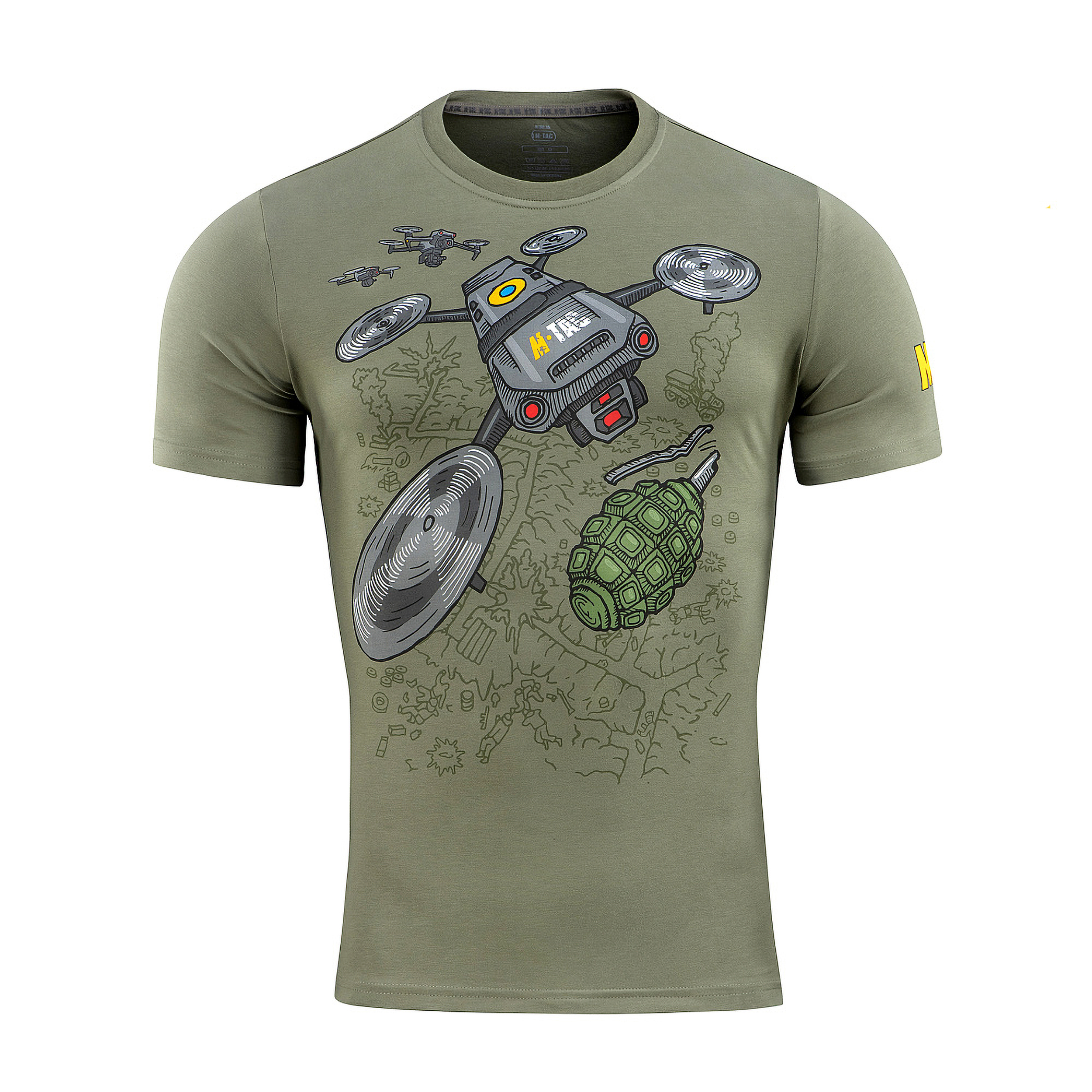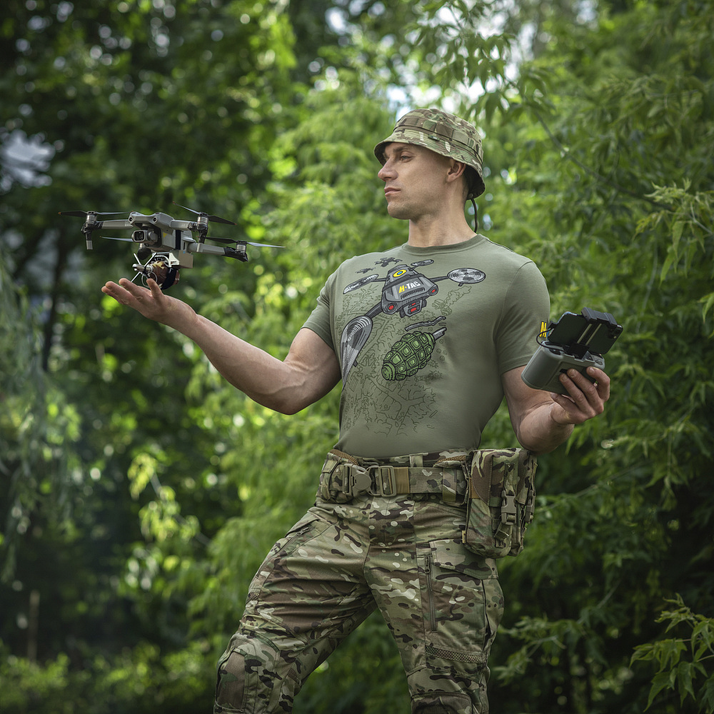 T-shirt M-Tac należy do serii tematycznej odzieży, wersja Dron przedstawia uzbrojone w granaty drony przelatujące nad polem bitwy i zrzucających granaty ręczne F1. Koszulka z krótkim rękawem M-Tac Dron szczególnie przypadnie do gustu miłośnikom militariów, którzy pragną wyróżnić się w tłumie pośród dziesiątek standardowych T-shirtów.