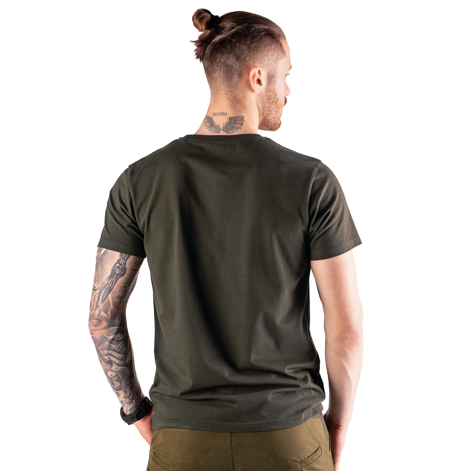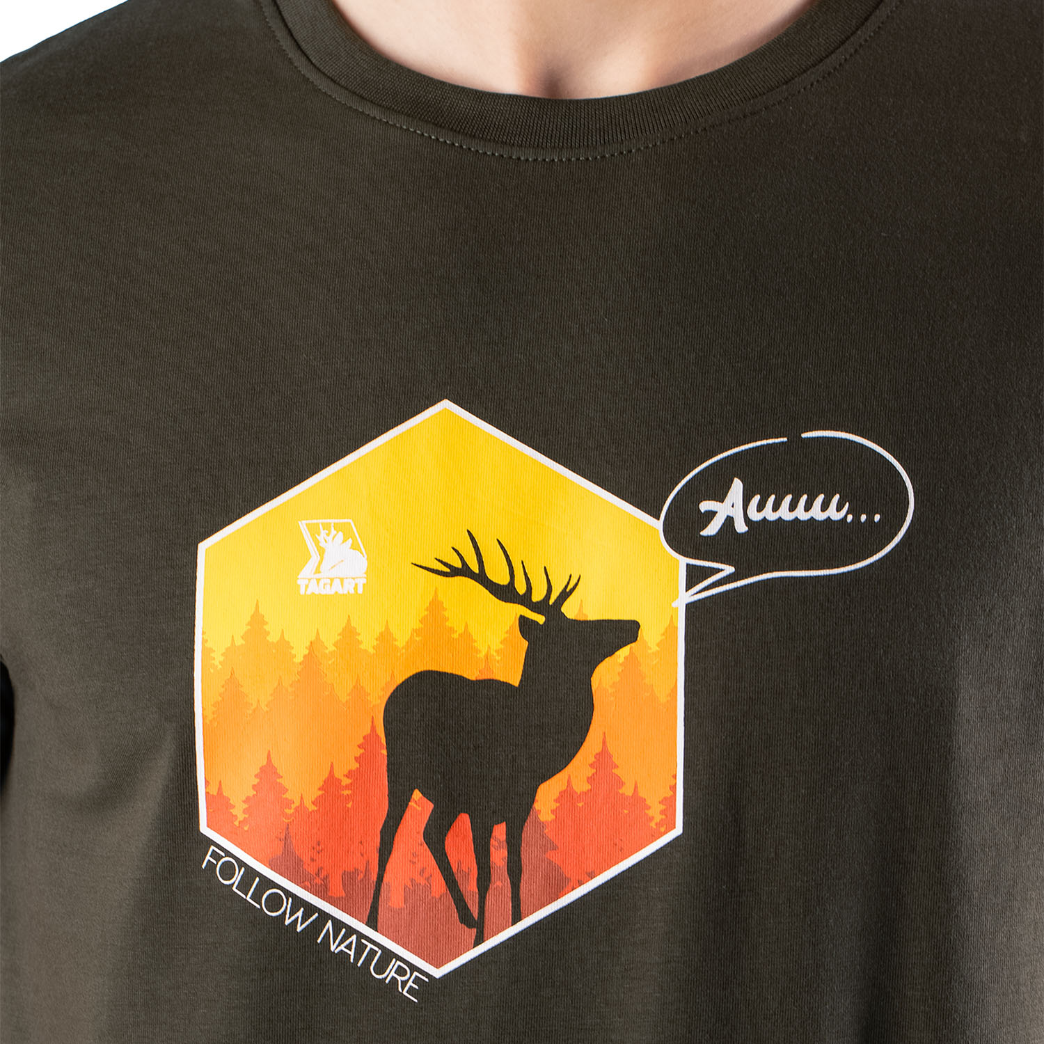 Nadruk umieszczony na froncie koszulki przedstawia tradycyjny motyw myśliwski w nowoczesnym wydaniu, co dodaje jej charakteru i może wyrażać osobisty styl. Każdemu miłośnikowi aktywnego trybu życia na świeżym powietrzu – turyście, myślowemu lub miłośnikowi bushcraftu – koszulka z pewnością przypadnie do gustu.