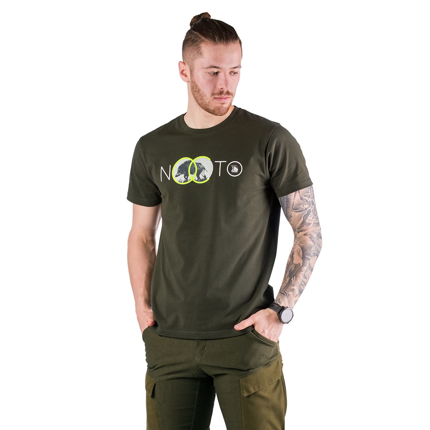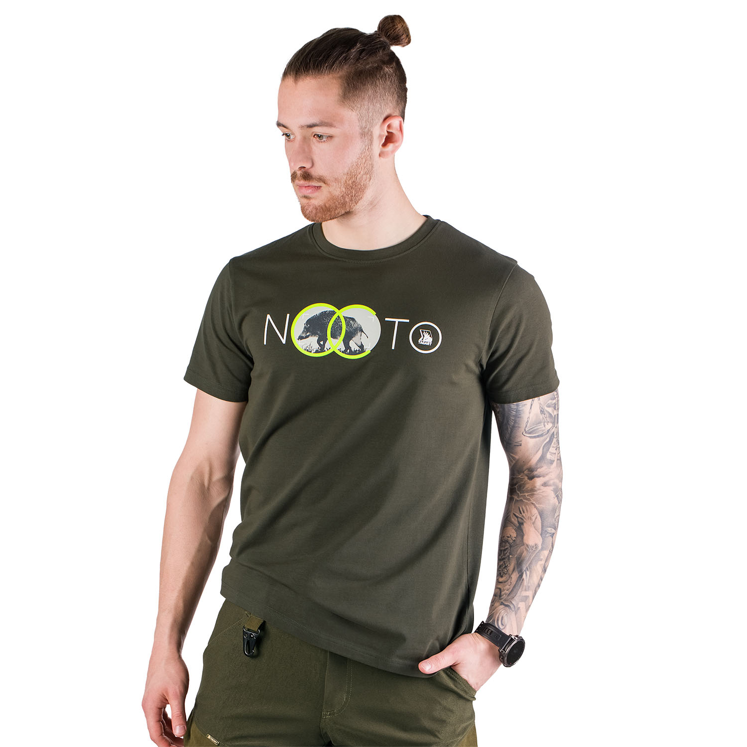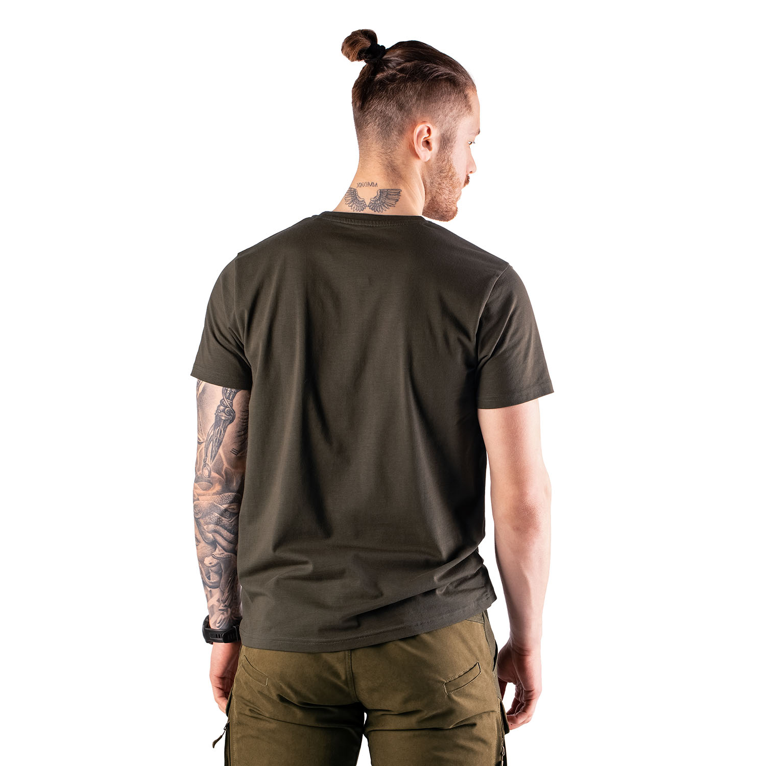 Nadruk umieszczony na froncie koszulki przedstawia tradycyjny motyw myśliwski w nowoczesnym wydaniu, co dodaje jej charakteru i może wyrażać osobisty styl. Każdemu miłośnikowi aktywnego trybu życia na świeżym powietrzu – turyście, myślowemu lub miłośnikowi bushcraftu – koszulka z pewnością przypadnie do gustu.