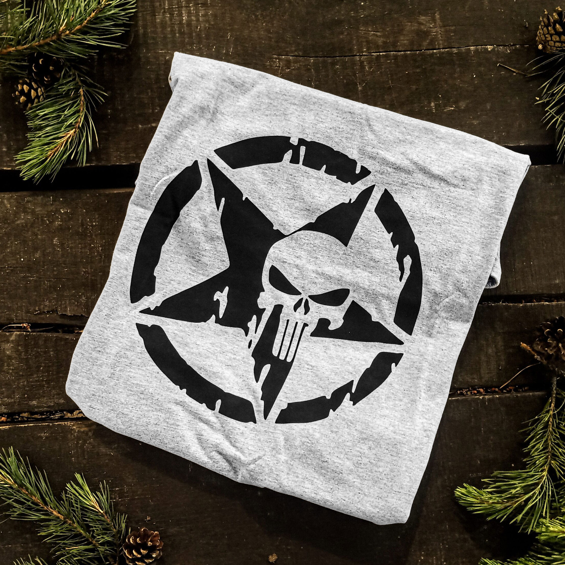 TigerWood Military Punisher szara to bawełniana koszulka męska z nadrukiem Punisher. Doskonała na co dzień, świetnie sprawdzi się w połączeniu z każdym krojem spodni. TigerWood Military Punisher to zmilitaryzowana wersja koszulki z nadrukiem postaci.