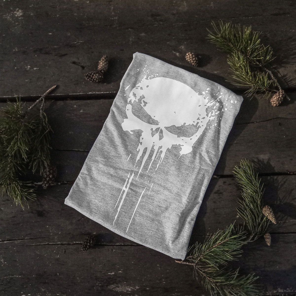 Na froncie koszulki zlokalizowany jest biały nadruk o wysokiej jakości wykonania. Punisher to kultowa postać komiksów, filmów i gier komputerowych. Jest bezpośrednio związany z półświatkiem militarnym, a przez to jest dobrze kojarzony w tym środowisku.