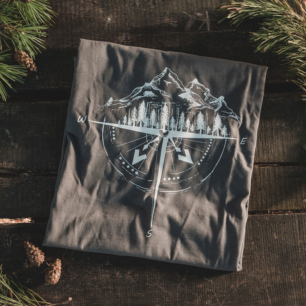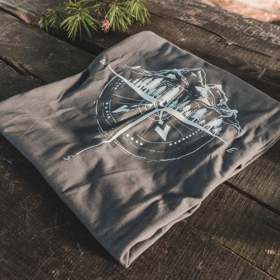 Na froncie koszulki znajduje się biały nadruk o wysokiej jakości wykonania. Nadruk przedstawia wskazującą kierunki świata różę wiatrów, las iglasty oraz widoczny w tle zarys pokrytych śniegiem gór. Koszulka przykuje uwagę pasjonatów wędrówek, podróży i krajobrazów górskich