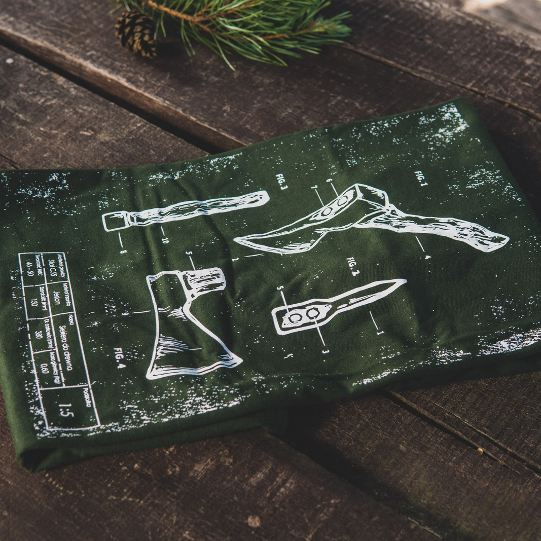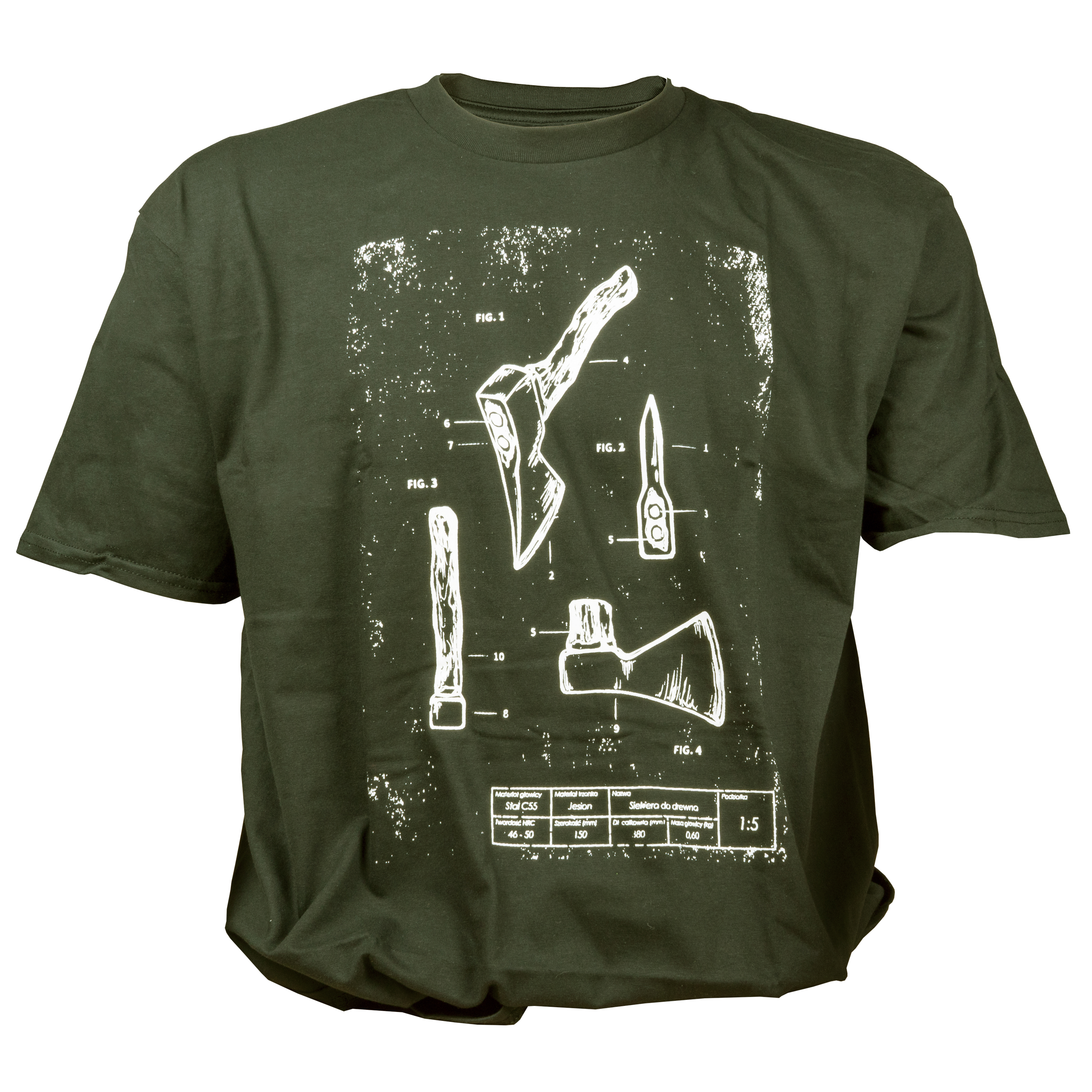 Na klatce piersiowej znajduje się biały nadruk o wysokiej jakości wykonania. Nadruk przedstawia ilustracje siekiery o stalowej głowicy wraz z tabelą atrybutów. Siekiera jest jednym z najważniejszych narzędzi leśnego bytowania, dlatego koszulka przypadnie do gustu pasjonatom bushcraftu.