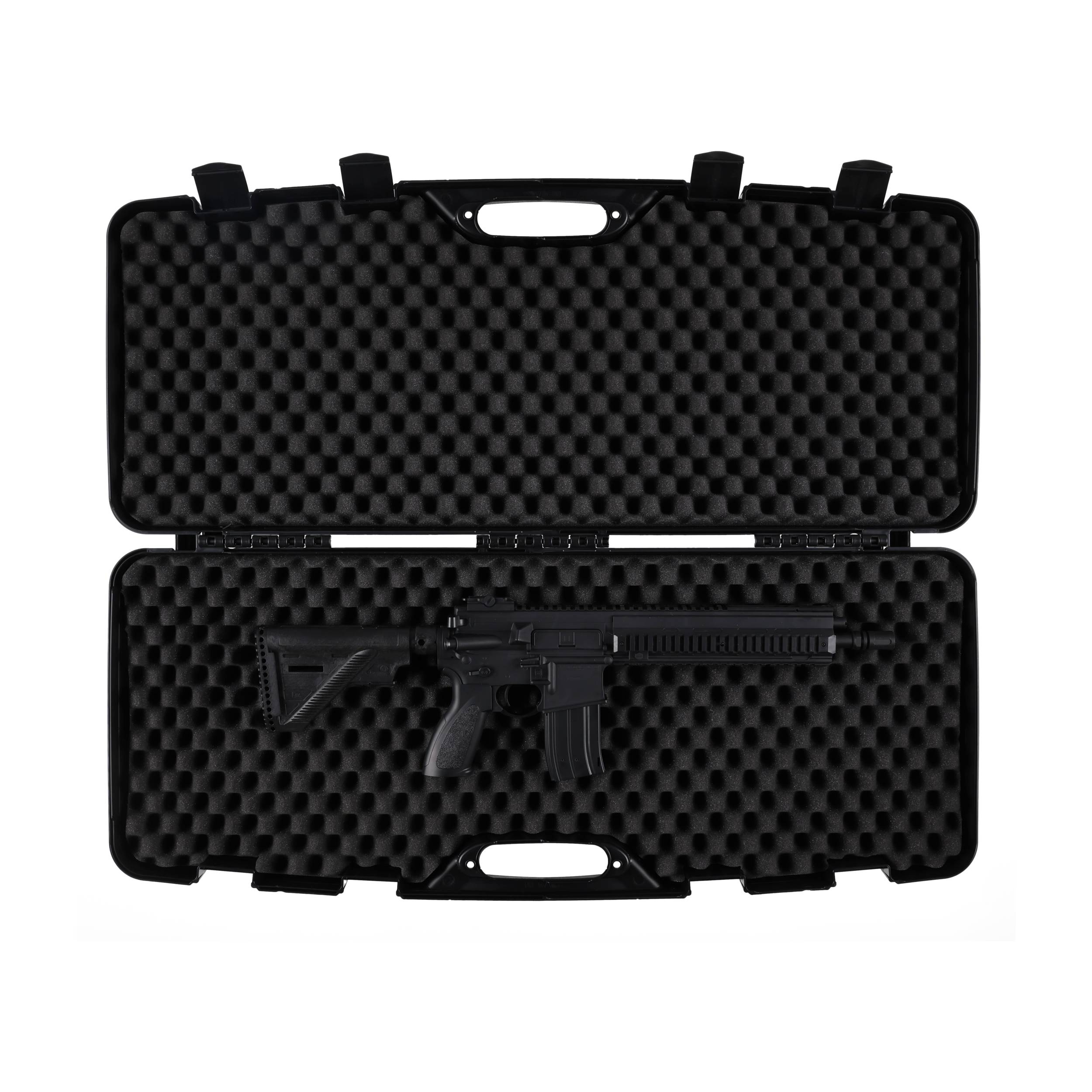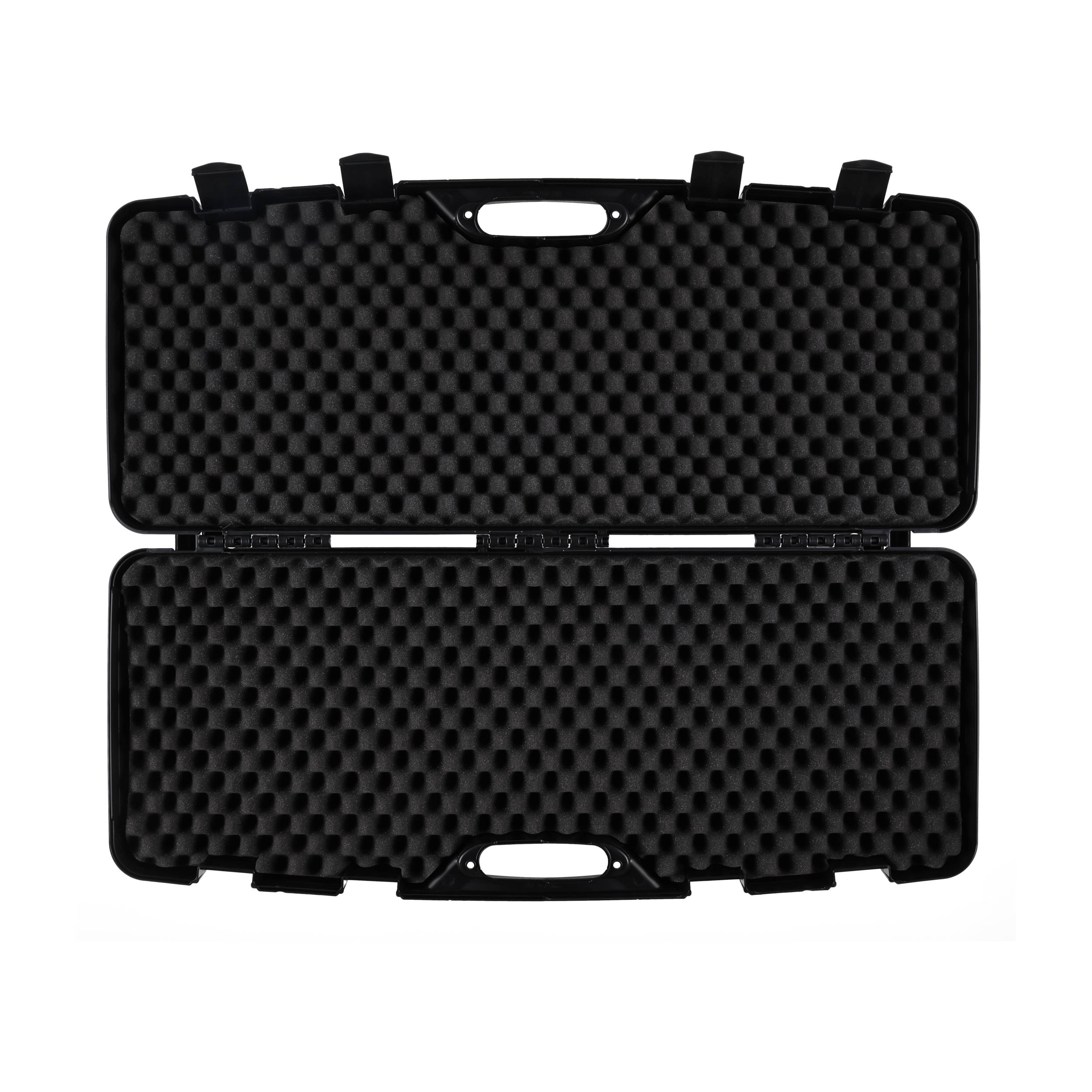 Kufer na broń Megaline czarny o wymiarach 98x35x12 cm to solidny futerał do przechowywania broni palnej i nie tylko. Wykonany został z tworzywa sztucznego i wyposażono go w 4 klamry zabezpieczające przed samoistnym otwarciem. Ma również chwyt transportowy w postaci wycięcia na dłoń. Wnętrze kufra wypełnia miękka gąbka o strukturze zębów rekina. Dzięki temu zawartość nie ulega przesuwaniu oraz uszkodzeniu w momencie przenoszenia. Futerał można zamknąć na kłódkę. Nadaje się też do transportowania replik airsoftowych oraz wiatrówek.