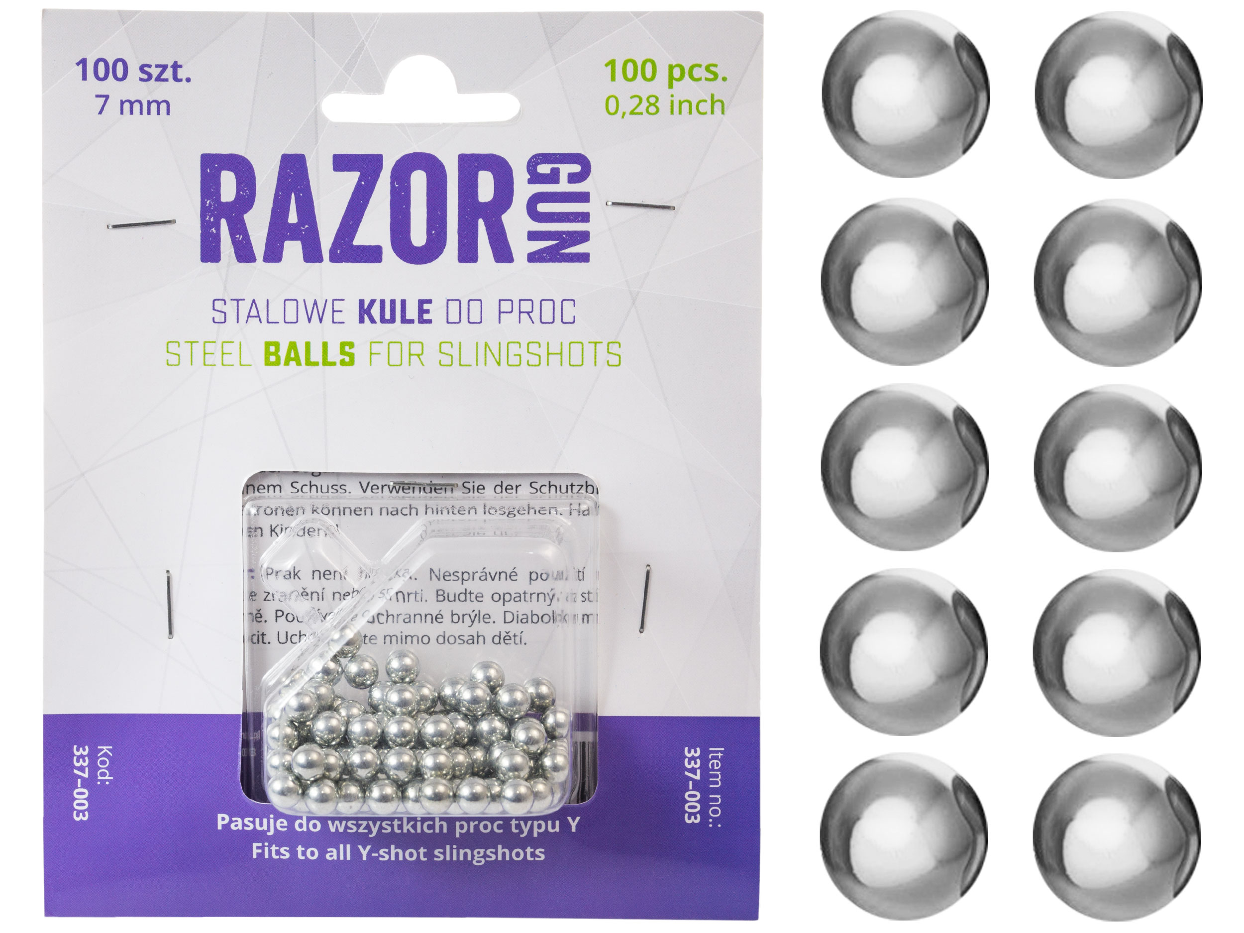 Metalowe kulki do procy RGun o średnicy 7 mm. Precyzyjne wykonanie i dokładnie wyważenie gwarantuje powtarzalność trafień. Tylko korzystanie z amunicji o powtarzalnych parametrach pozwala osiągnąć najlepsze wyniki.