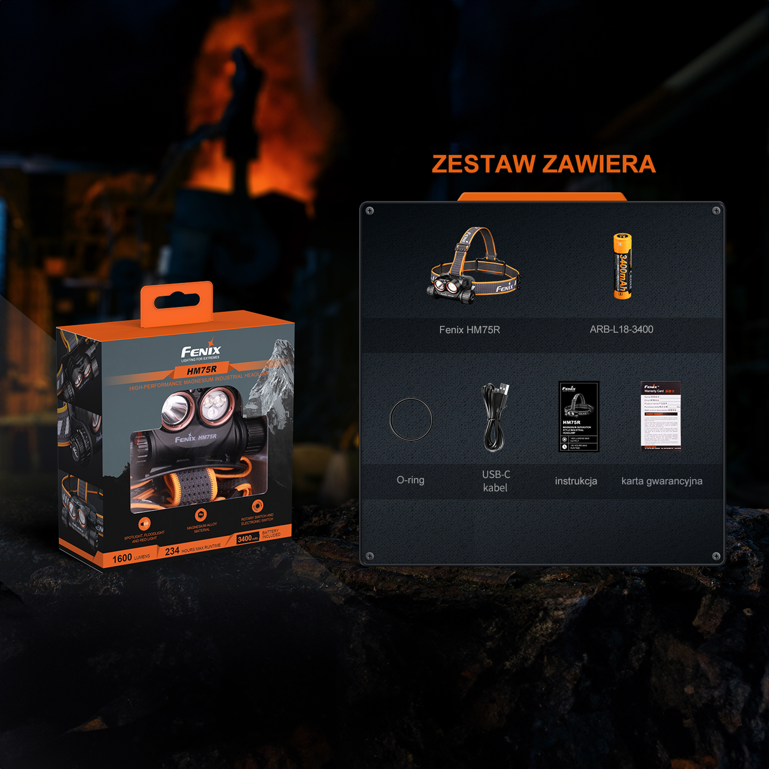 Fenix HM75R to latarka czołowa wyposażona w aż cztery emitery światła, system ładowania przez port USB-C oraz podwójny system zasilania. Dzięki wykorzystaniu tego ostatniego latarka może pracować przez 234 godziny w trybie niskiego poboru mocy i 14 godzin w trybie wysokiego poboru mocy. Chwilowy tryb turbo pozwala natomiast na osiągnięcie strumienia o mocy aż 1600 lumenów.