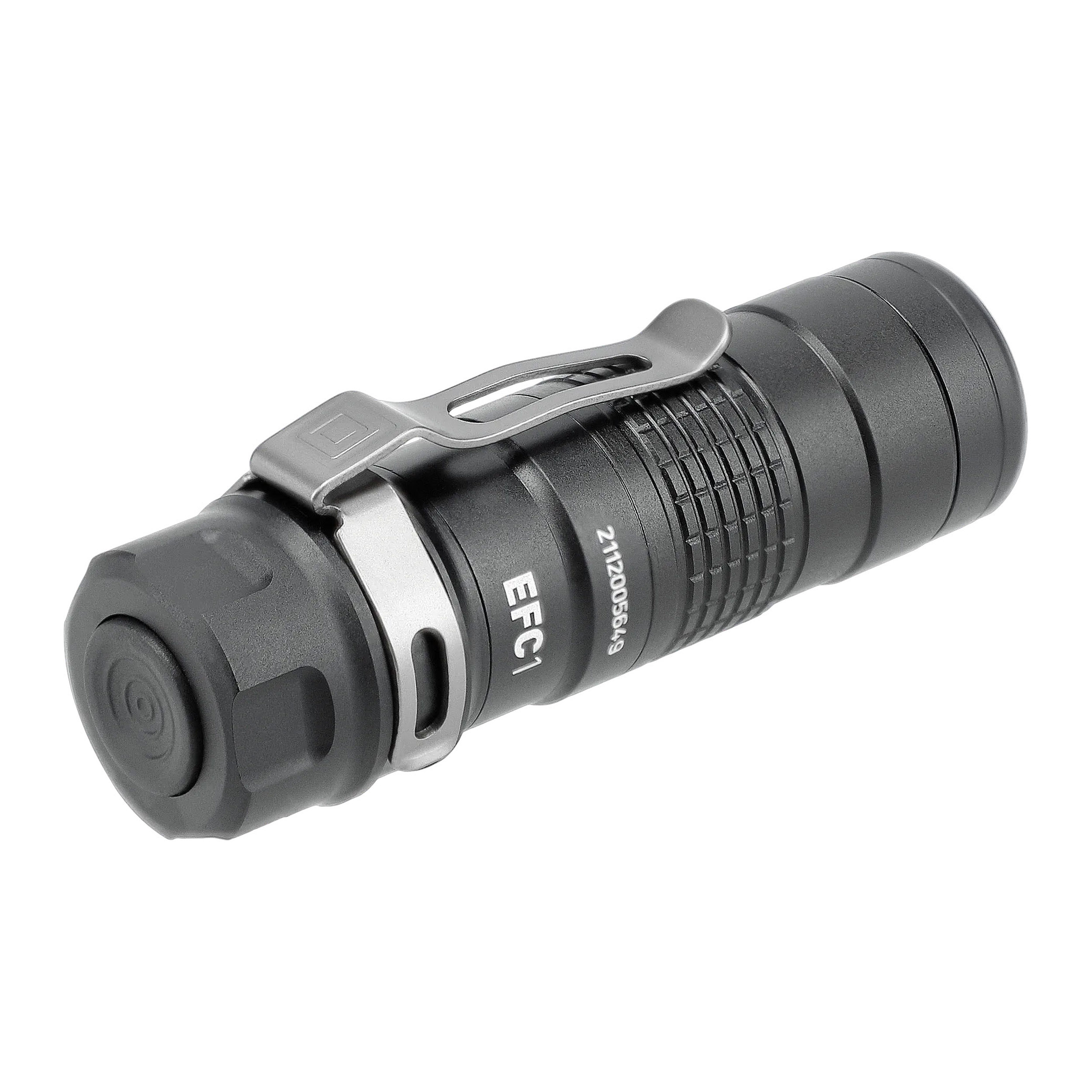 Kompaktowa i wszechstronna latarka Walther EFC1 o kieszonkowych wymiarach oferuje cztery poziomy jasności (5/50/200/400 lumenów) oraz tryby stroboskopowy i beacon (lampa błyskowa). Sterowanie odbywa się za pomocą tylnego włącznika, który umożliwia szybkie włączanie/wyłączanie i chwilowe światło, natomiast boczny przełącznik odpowiada za zmianę jasności i dostęp do trybów specjalnych. Lampa zapamiętuje ostatnio używany poziom jasności i uruchamia się na tym samym ustawieniu. Wbudowane ostrzeżenie informuje o spadku pojemności baterii poniżej 25%.