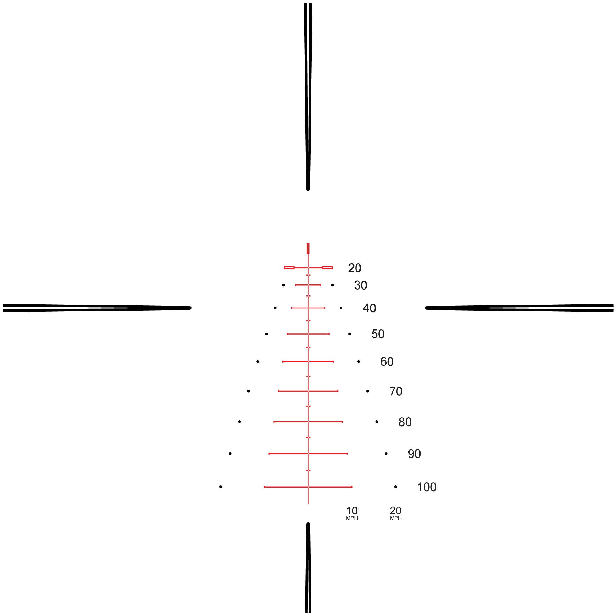 Luneta ma podświetlaną na czerwono siatkę celowniczą XB30 Compact SR w drugim planie, z nastawami do precyzyjnego na dystansie od 18 do 91 m (zero na 18 m) oraz stałą paralaksą ustawioną na 46 m. Siatka składa się z 4 zwężających się ku środkowi ramion, podświetlanego krzyża celowniczego z precyzyjną podziałką zasięgu (co 5 jardów) oraz znacznikami do nanoszenia poprawek na wiatr. Na okularze znajduje się pierścień do regulacji dioptrii oraz blokowane pokrętło (zgłoszone do opatentowania) pełniące 2 funkcję: zmiany powiększenia, oraz definiowania prędkości bełtów wystrzeliwanych z naszej kuszy. Aby precyzyjnie zgrać siatkę celowniczą z kuszą, wystarczy ustawić pierścień powiększenia/ FPS na wartości odpowiadającej parametrom naszych strzałów. Po wyzerowaniu krzyża na 50 jardach (45 m) i ustawieniu prędkości początkowej FPS, wskaźniki krzyża będą precyzyjnie dopasowane do trajektorii opadu bełtów.