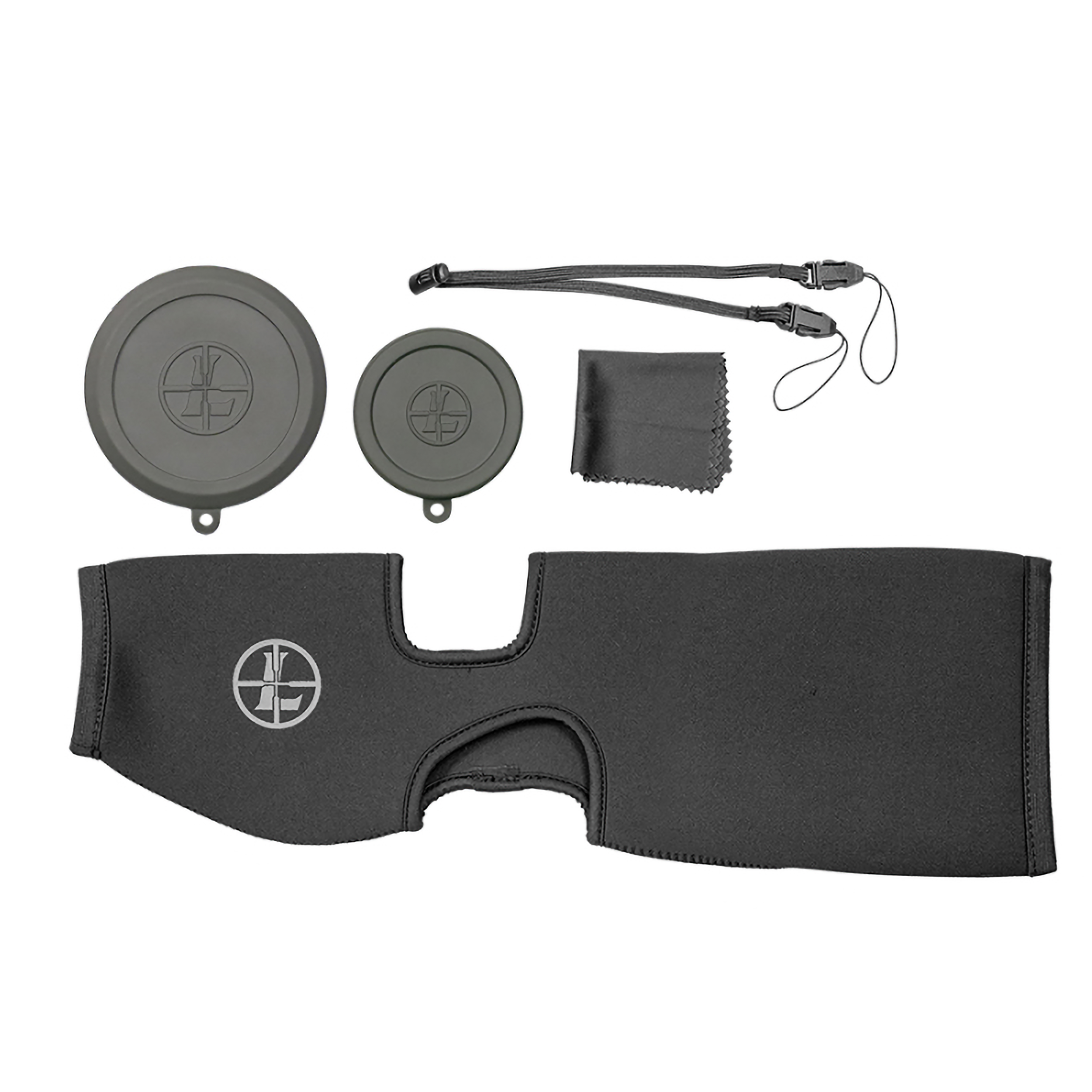 Elementy zestawu lunety: pokrowiec neoprenowy, zakrywki na szkła, ściereczka do czyszczenia optyki