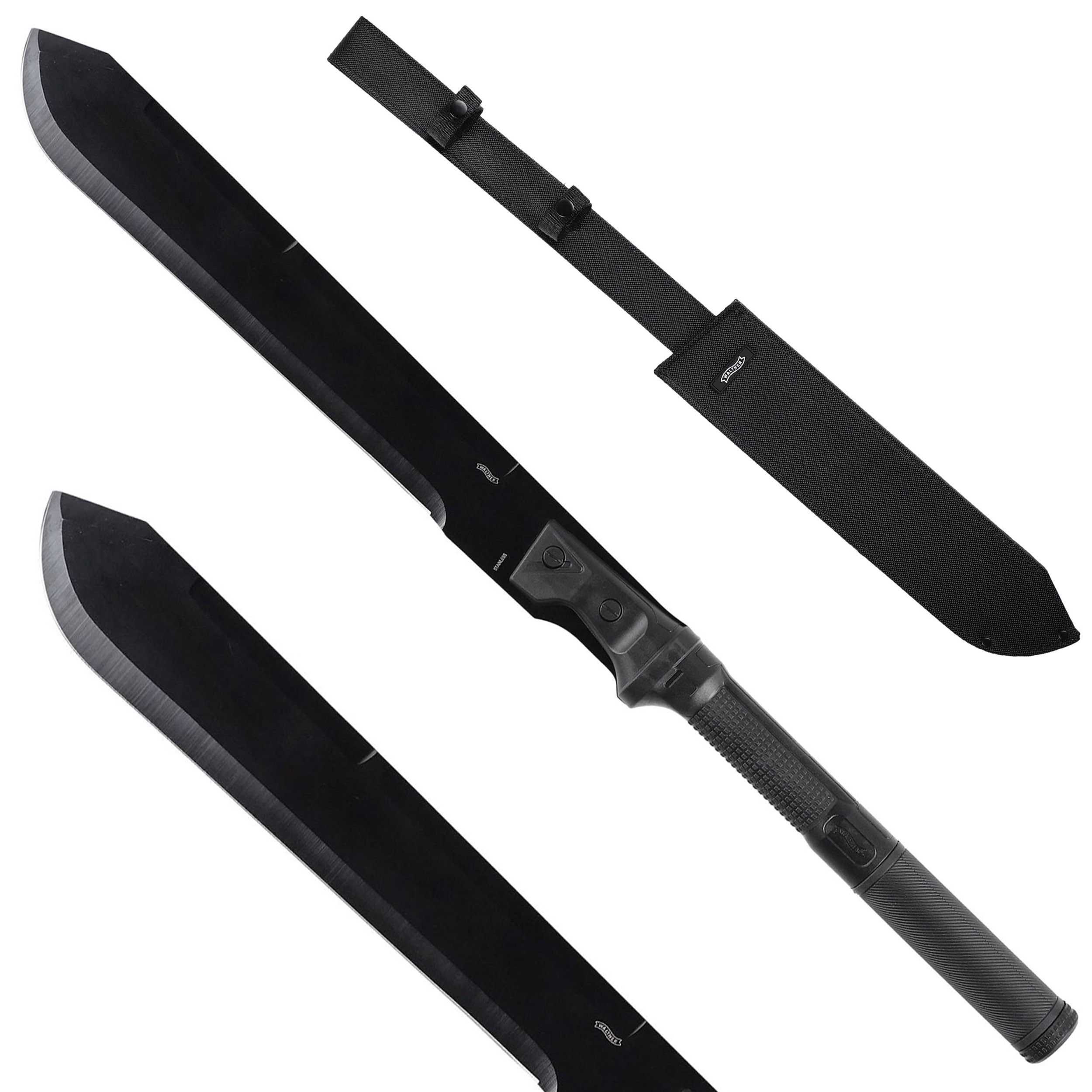 - W zestawie nylonowa pochwa: Maczeta wyposażona jest w nylonową pochwę zapinaną na napy, co umożliwia wygodne i bezpieczne przenoszenie narzędzia przy pasie.