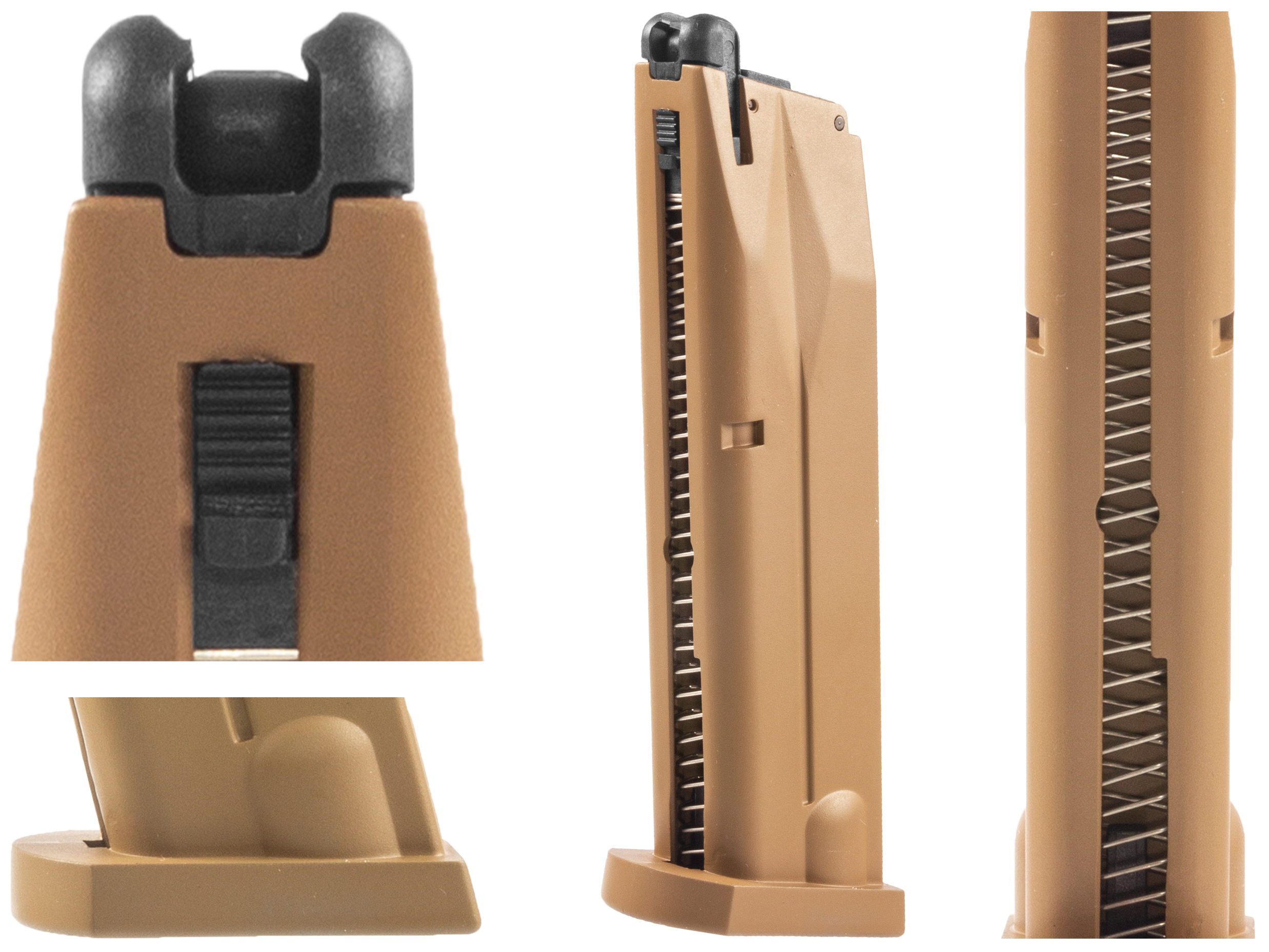 Zapasowy magazynek o pojemności 16 śrutów kalibru 4,5 mm BB, dedykowany do pistoletu wiatrówki Beretta M9 A3 FDE 6 mm. Korpus magazynka wykonano z metalu, stopka oraz donośnik śrucin są polimerowe. Co więcej donośnik magazynka można zablokować w dolnym położeniu, co ułatwia ładowanie śrutu. W magazynku mieści się także 12 g kapsuła CO2 zasilającą wiatrówkę.
