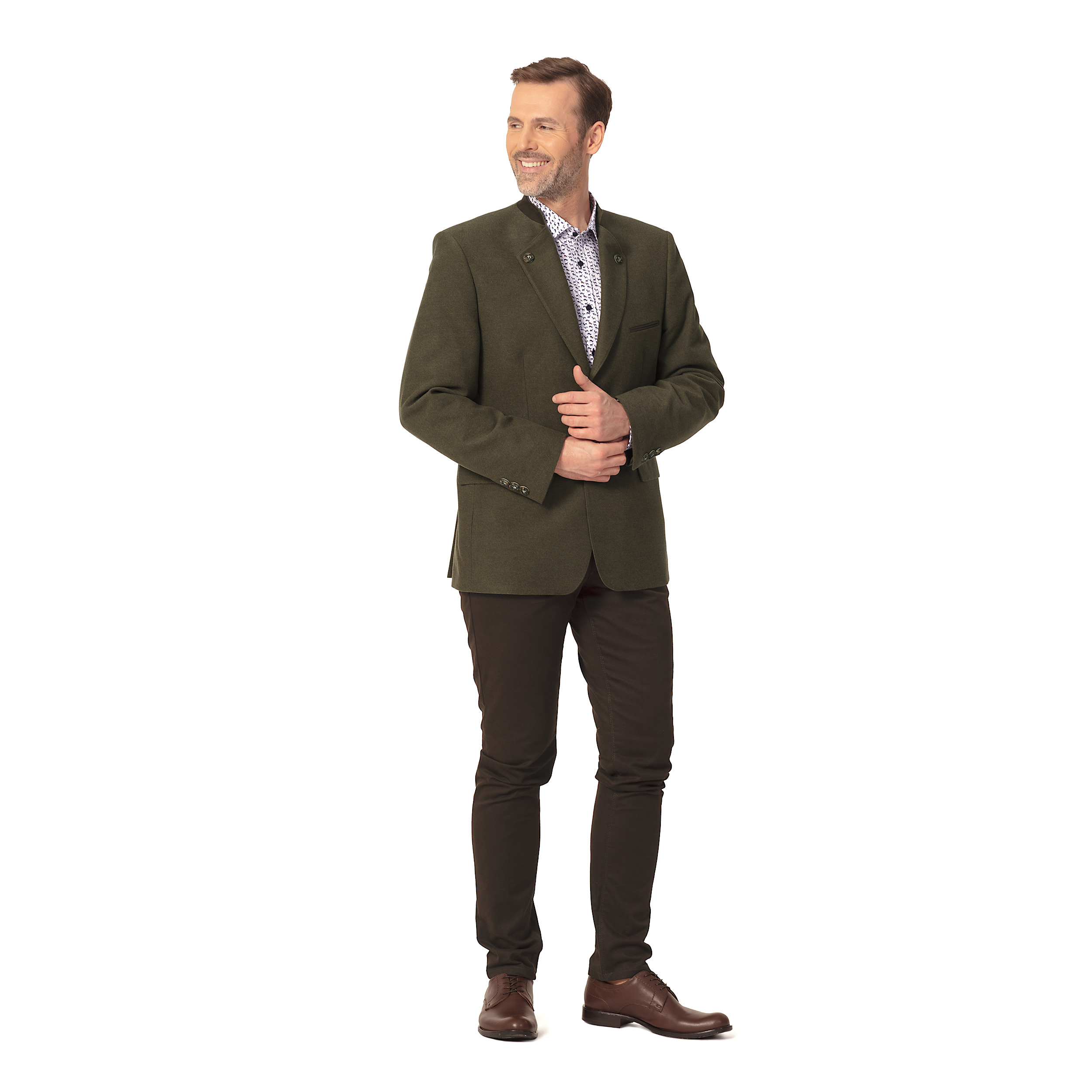 Klasyczny, a zarazem swobodny krój przypadnie do gustu miłośnikom jazdy konnej i myślistwa. Dodatek rayonu zapewnia przewiewność oraz miękkość, co czyni marynarkę wyjątkowo przyjemną w noszeniu. Oliwkowy melanż sprawia, że marynarka jest uniwersalnym elementem garderoby na różne okazje.