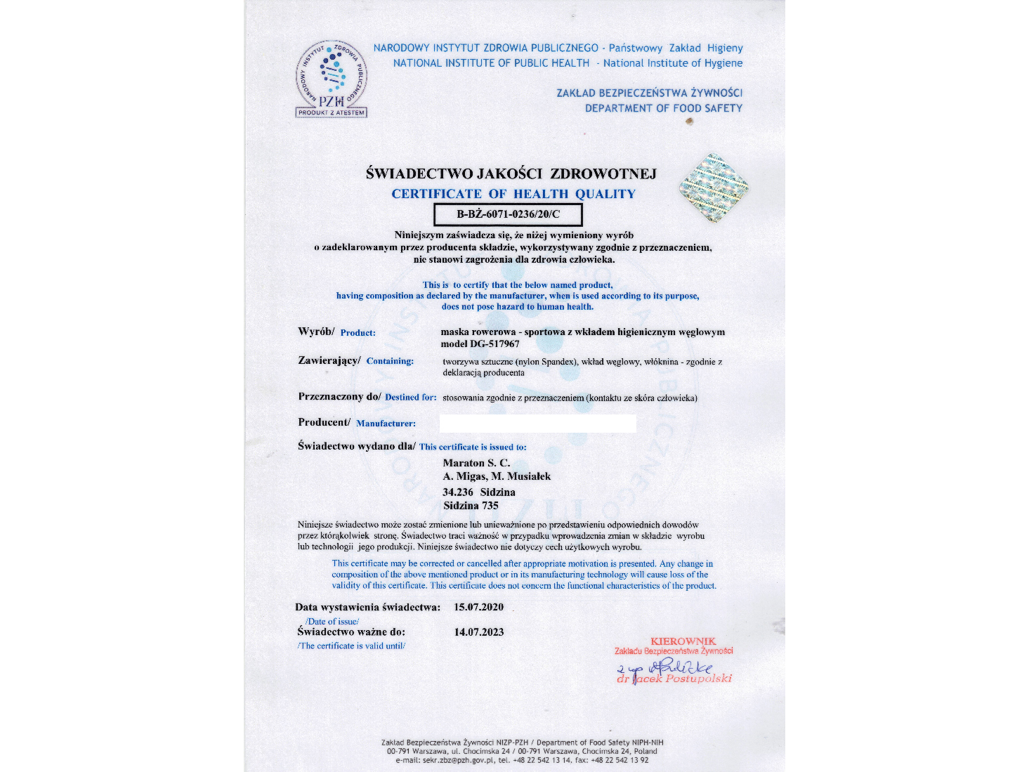 Maseczkę Maraton zaprojektowano z myślą o pasjonatach aktywności sportowej na wolnym powietrzu, szukających ochrony podczas biegania, jazdy na rowerze, rolkach, hulajnodze.