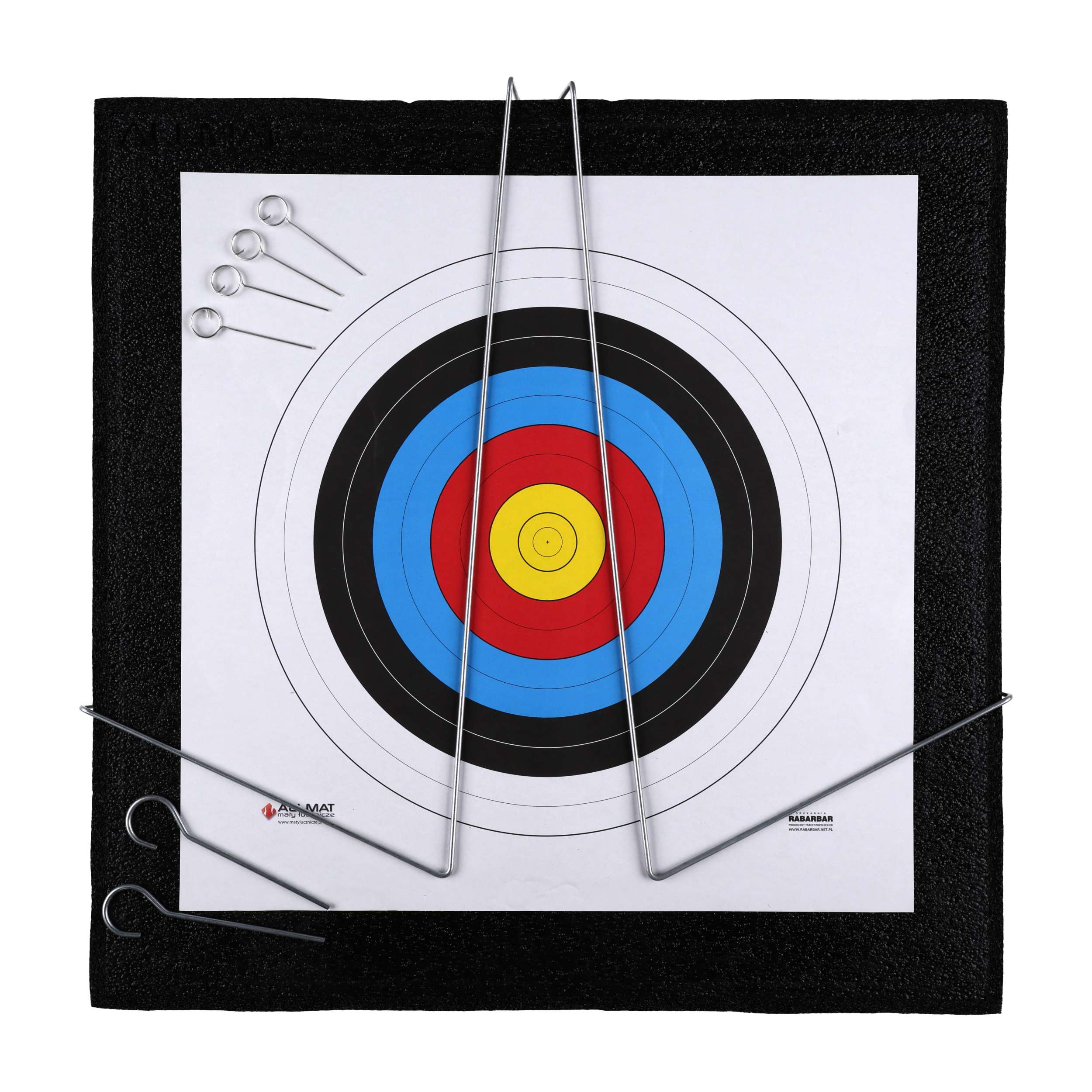 W zestawie z matą łuczniczą użytkownik otrzymuje matę łuczniczą, aluminiowy stelaż oraz uchwyty do tarczy..