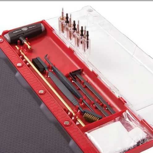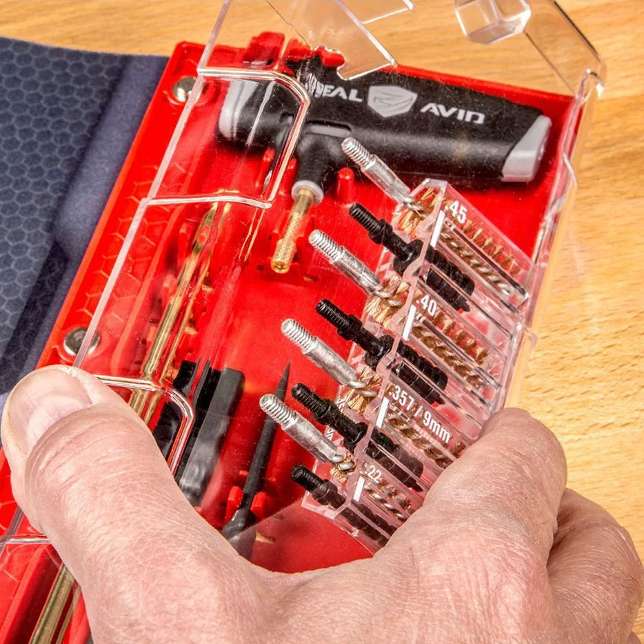 Real Avid Master Cleaning Station oferuje wszechstronny i kompleksowy przegląd narzędzi, niezbędnych do konserwacji broni krótkiej. Połączenie wieloczęściowego wyciora, szczotek, skrobaków oraz haczyków zagwarantuje nam maksymalną funkcjonalność. Szereg miedzianych szczotek, mopów oraz uchwytów na przecieraki sprawia natomiast, że zestaw pozwoli nam uporać się z nagarem w lufach o najpopularniejszych kalibrach. Dzięki zintegrowanej macie Smart Mat, zarówno nasza broń, jak i blat na którym przeprowadzamy czyszczenie, będą skutecznie zabezpieczone przed uszkodzeniem.