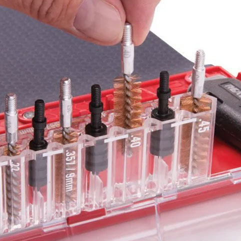 W zestawie znajdziemy szczotki, mopy oraz uchwyty na przecierak dostosowane do kalibrów: .22, .357 / .38 / 9 mm, .40 oraz .45.