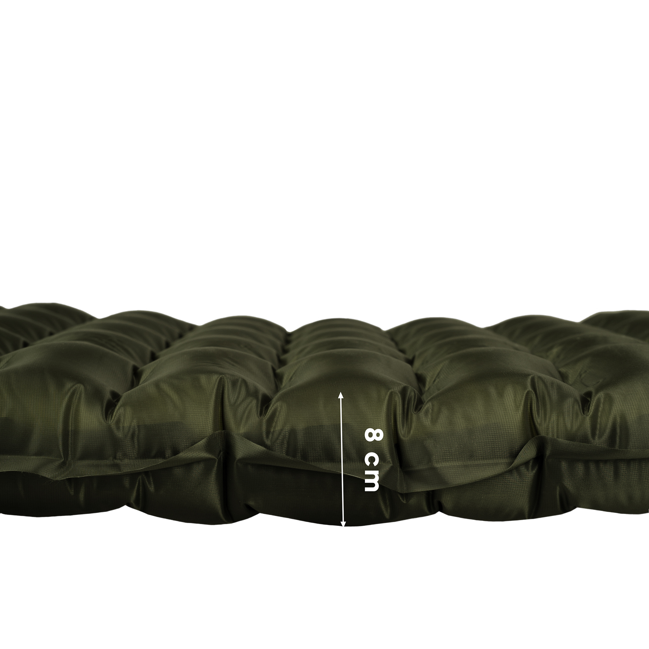 Dodatkowa materac jest wyposażony w specjalną powłokę TPU, zapewniając wodoodporność. Nie ma zatem problemu aby stosować go w warunkach zwiększonej wilgotności lub na mokrym podłożu. Po napompowaniu mata osiąga wymiary 185 cm × 53 cm × 8 cm, oferując komfortową przestrzeń do spania przy zachowaniu kompaktowych wymiarów po spakowaniu.