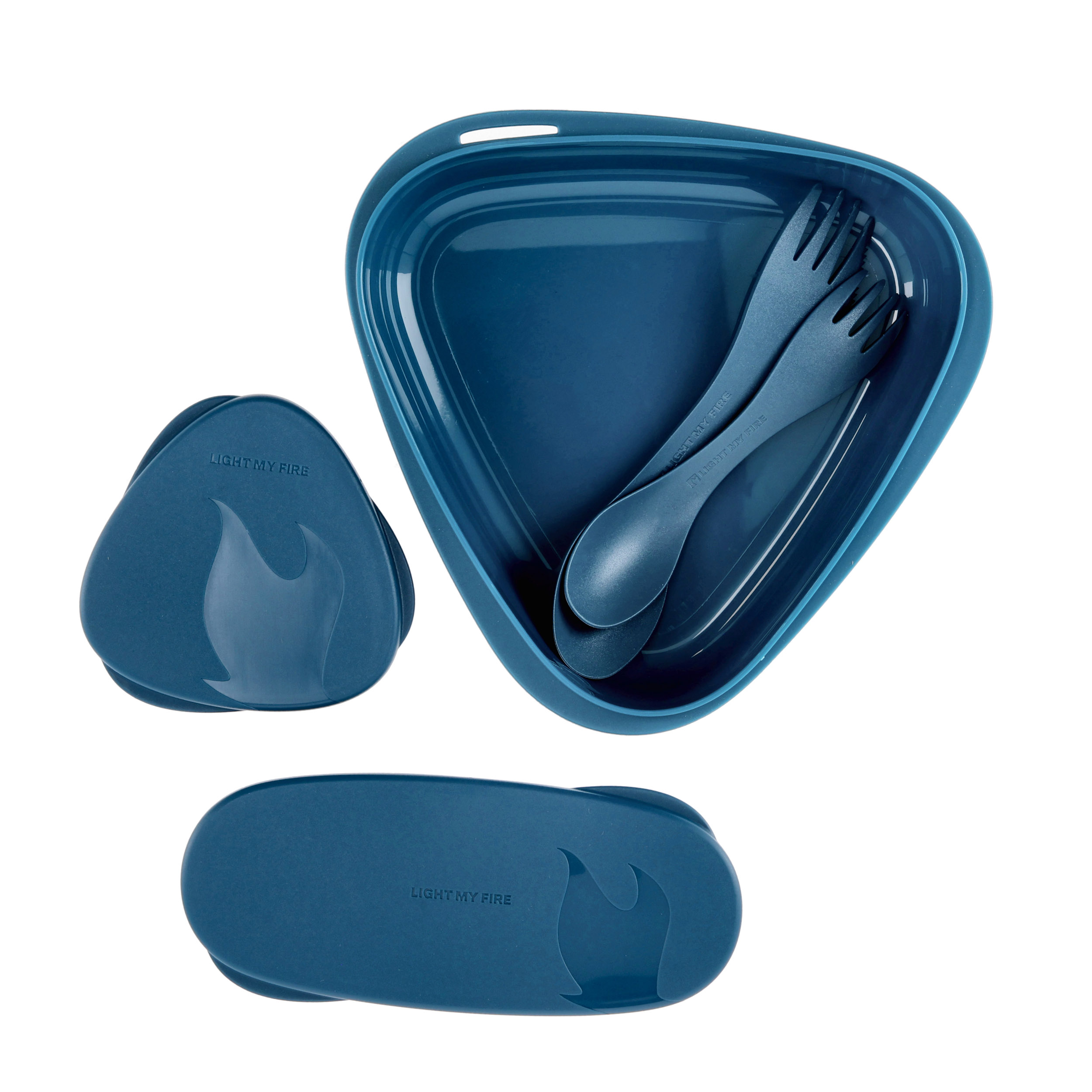 Light My Fire LunchKit 2.0 to kompletny zestaw do spożywania posiłków poza domem: praca, szkoła, piknik czy wakacje. Zawiera w sobie dwa talerze, uniwersalne sporki (duży oraz mały) oraz dwa szczelne pojemniki typu SnapBox o różnych kształtach i pojemnościach, ułatwiające organizację i transport jedzenia. Produkty są w pełni ekologiczne, wolne od BPA. Przedstawiona wersja jest w kolorze mglistego granatu.