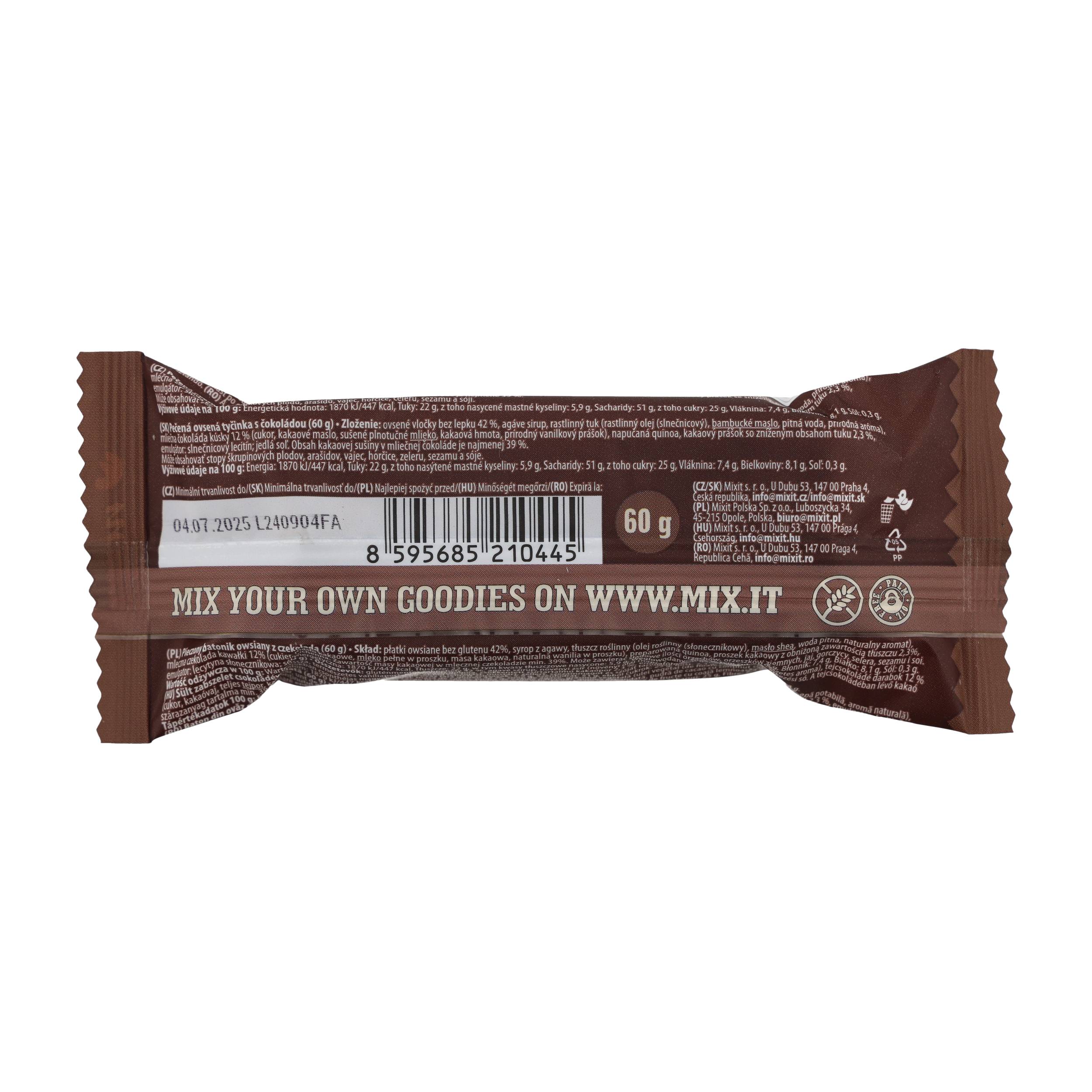 Mixitka Mixit czekoladowa to energetyczny batonik o wadze 60 gramów z dodatkiem dużej ilości czekolady. Jest to idealna przekąska między posiłkami lub małe co nieco podczas dowolnej aktywności fizycznej.
