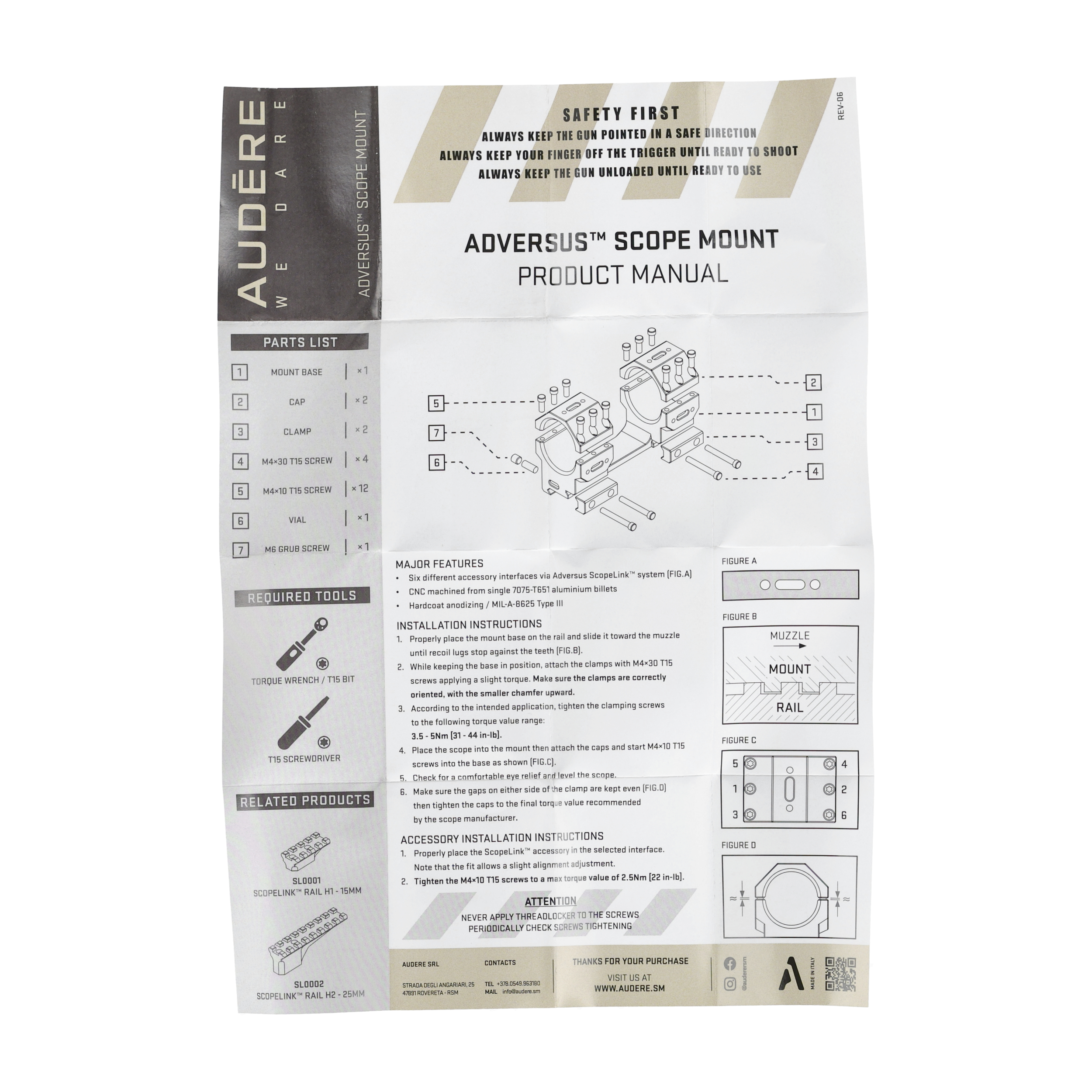 Prosty system instalacji oparty na śrubach Torx łączy w sobie ograniczenie masy z wysoką sztywnością i dopasowaniem, dzięki czemu montaż lunety Audere Adversus jest bez problemu w stanie wytrzymywać wstrząsy generowane przez mocne kalibry do strzelań długodystansowych. Akcesorium zostało również wyposażone w system interfejsu ScopeLink, który umożliwia montaż dodatkowych akcesoriów. Aby zapewnić możliwość zachowania niskiego profilu, otwory ScopeLink umieszczono zarówno na szczycie montażu jak i na boku pod kątem 90 stopni. Dzięki temu wspierający lunetę kolimator nie będzie przewyższał konstrukcji, jednocześnie będąc łatwo dostępny dla oka.