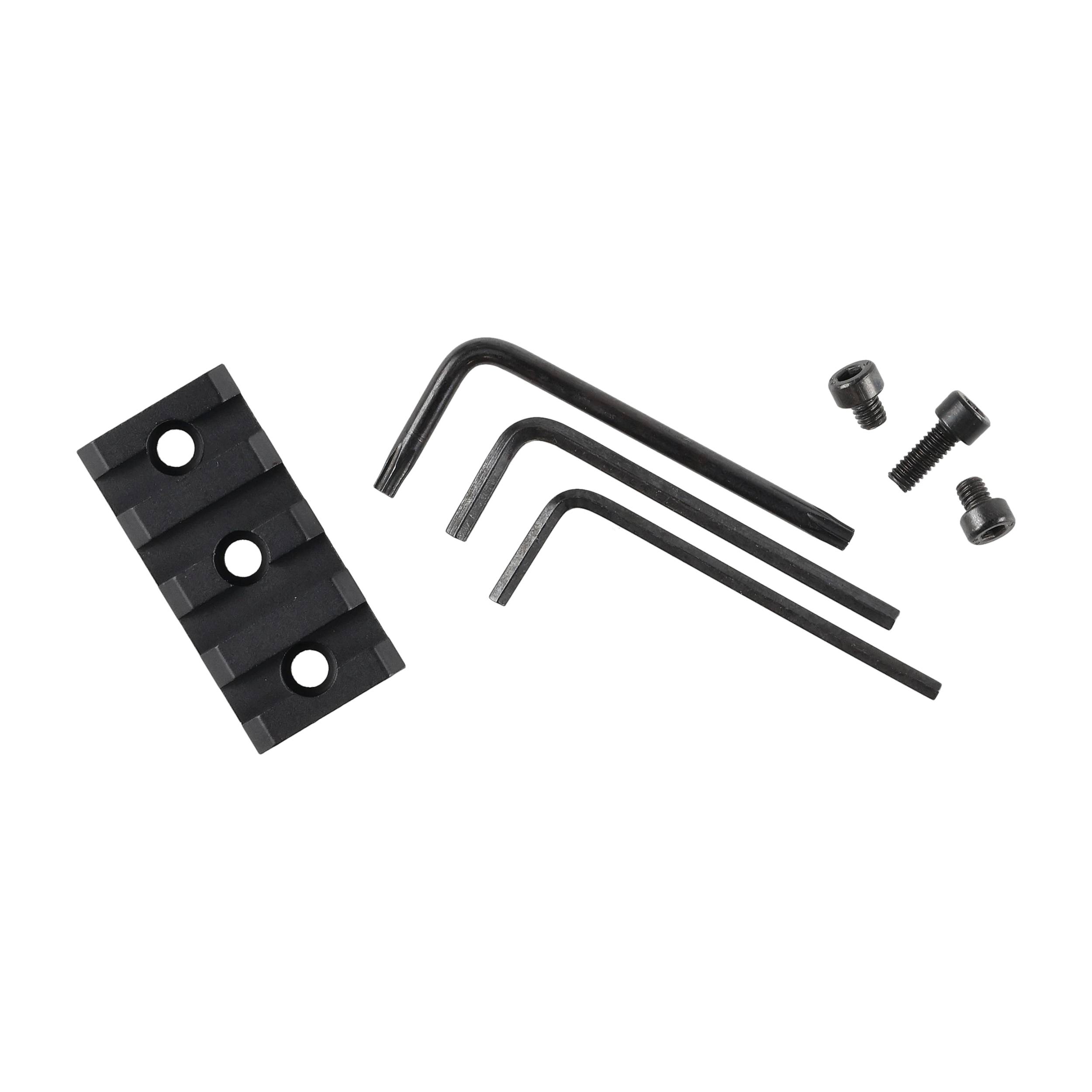 Dodatkowo w zestawie znajduje się szyna montażowa, która umożliwia zamontowanie dodatkowych akcesoriów, takich jak mały kolimator lub laser, bezpośrednio nad lunetą. Szynę można umiejscowić w sześciu różnych pozycjach na montażu, co pozwala na lepsze dostosowanie do indywidualnych potrzeb strzelca.
