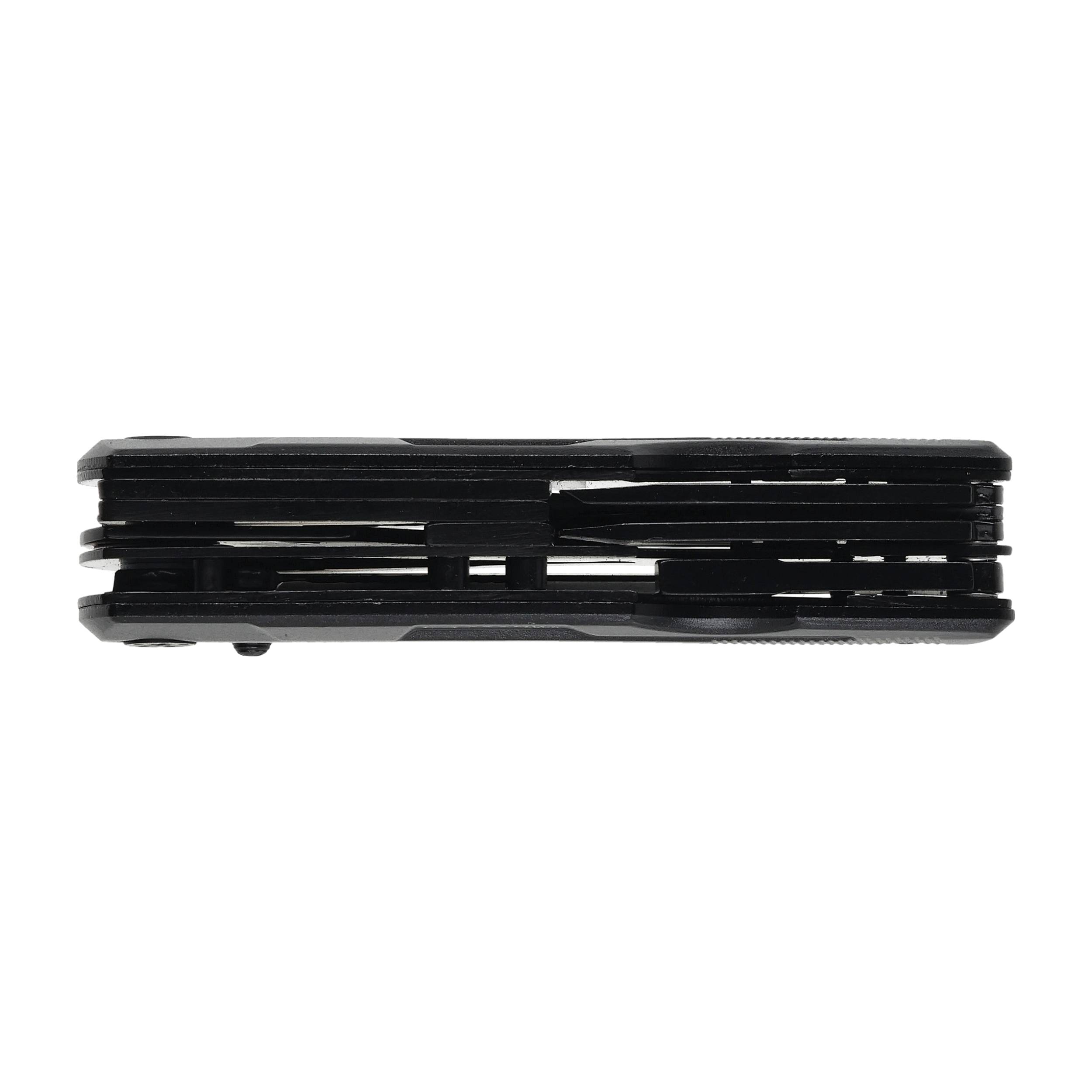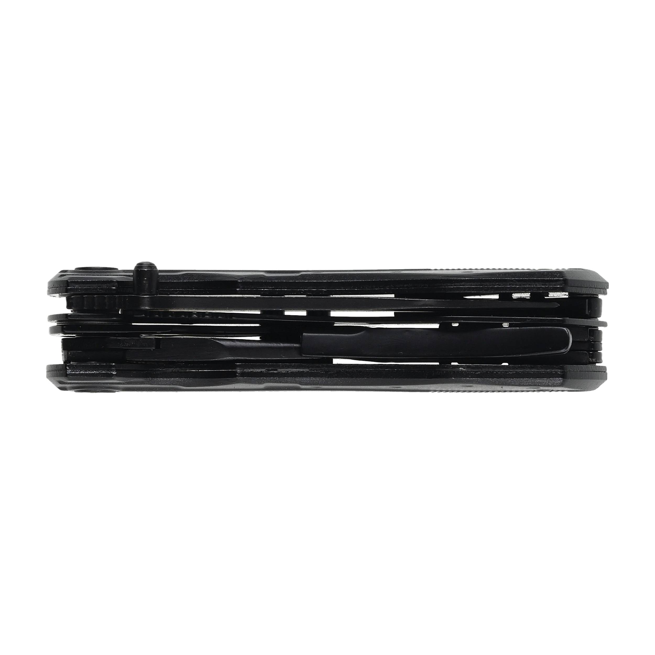 Multitool wyposażono w 11 przydatnych narzędzi, dzięki którym każde domowe i turystyczne zadanie wykonasz bez zbędnego stresu. Mocne obcęgi płaskie i ząbkowane zostały wyposażone w przecinak drutu, zapewniając sprawną i komfortową pracę. Nie zabrakło również otwieraczy do butelek i konserw oraz długiego, praktycznego noża z ostrzem o szlifie ząbkowanym w jednej połowie i gładkim w drugiej. System wymiennych bitów umożliwia korzystanie z 9 różnych wkrętaków: 3 płaskich (3 mm, 5 mm i 7 mm), 3 krzyżakowych (mały, średni i duży) i 3 sześciokątnych (mały, średni i duży). Bity wkłada się do przejściówki magnetycznej a następnie nakłada ją na adapter, co zapobiega zgubieniu bitów podczas pracy. Adapter można ustawić pod dogodnym kątem dla maksymalnej wygody użytkowania.