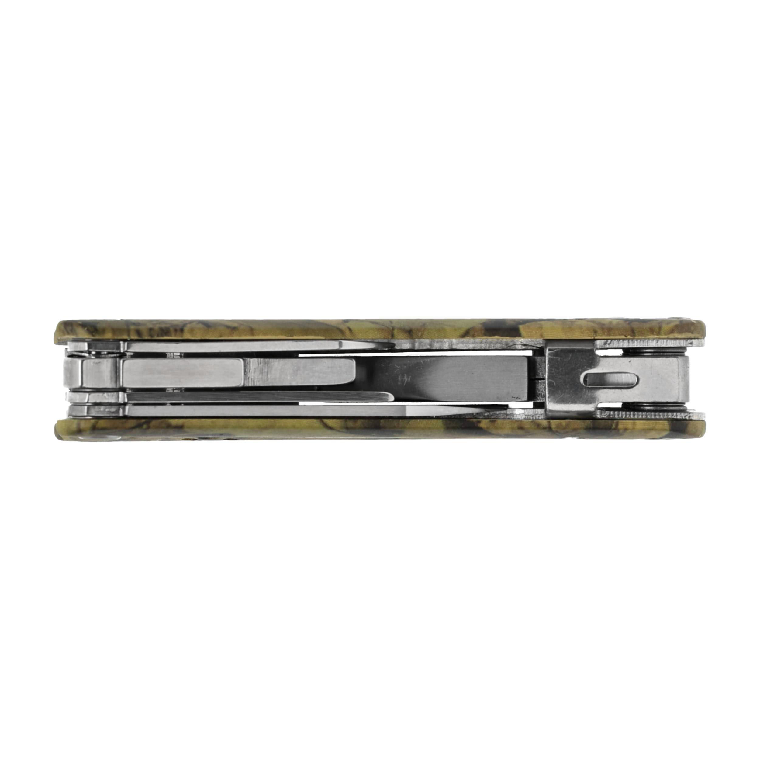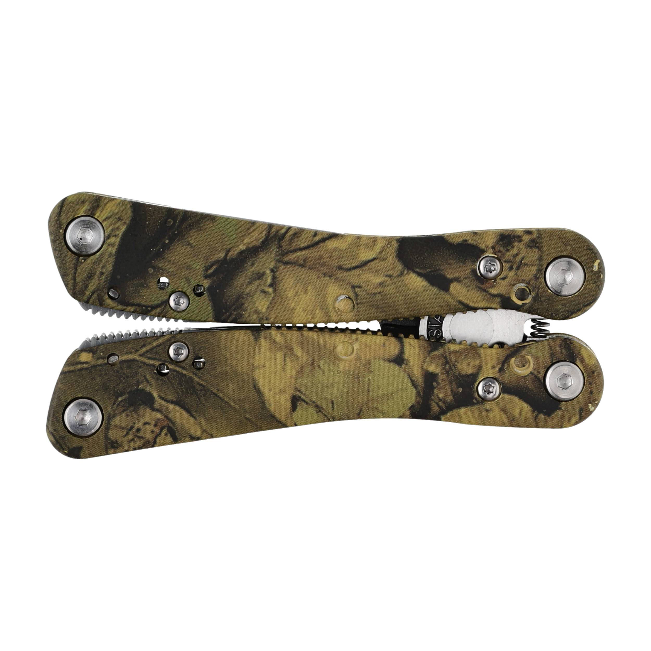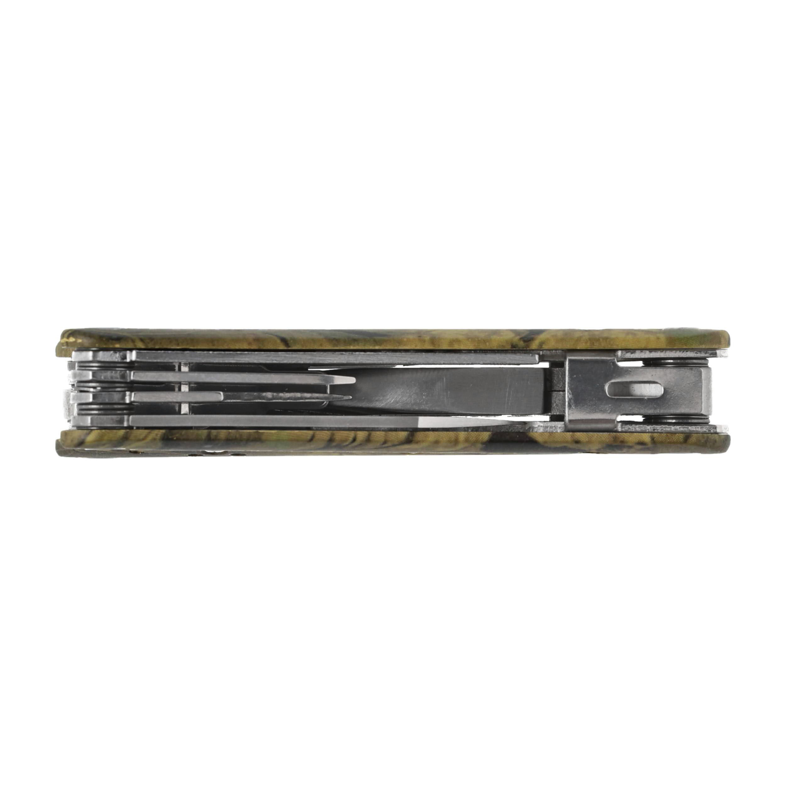 Dodatkowo na okładziny rękojeści producent naniósł atrakcyjny kamuflaż. Rękojeść została wykonana z aluminium, a jej ergonomiczne profilowanie umożliwia pewne operowanie narzedziami. Pewny chwyt umożliwiają karbowane brzegi. W komplecie 9 funkcjonalnych bitów.