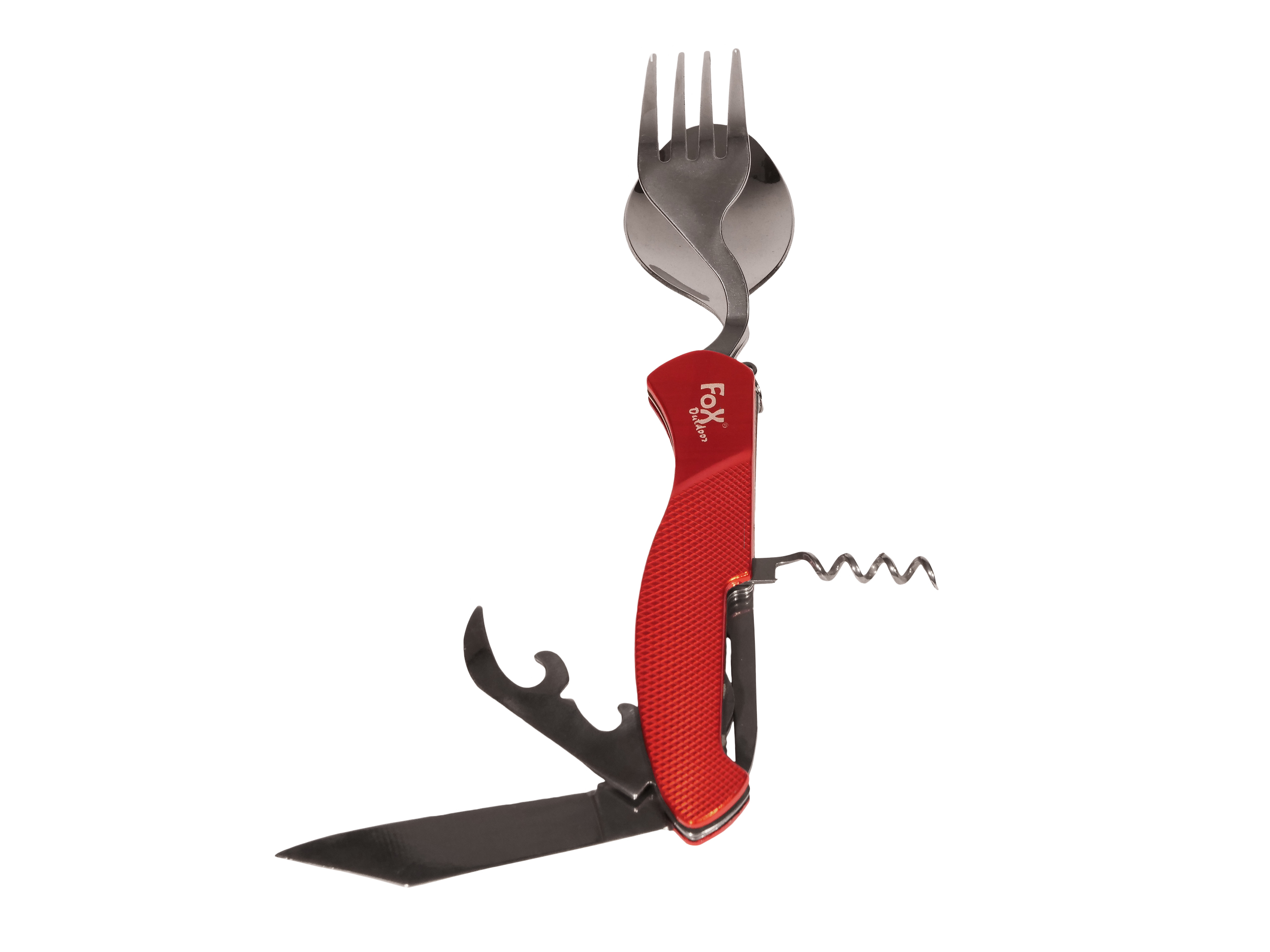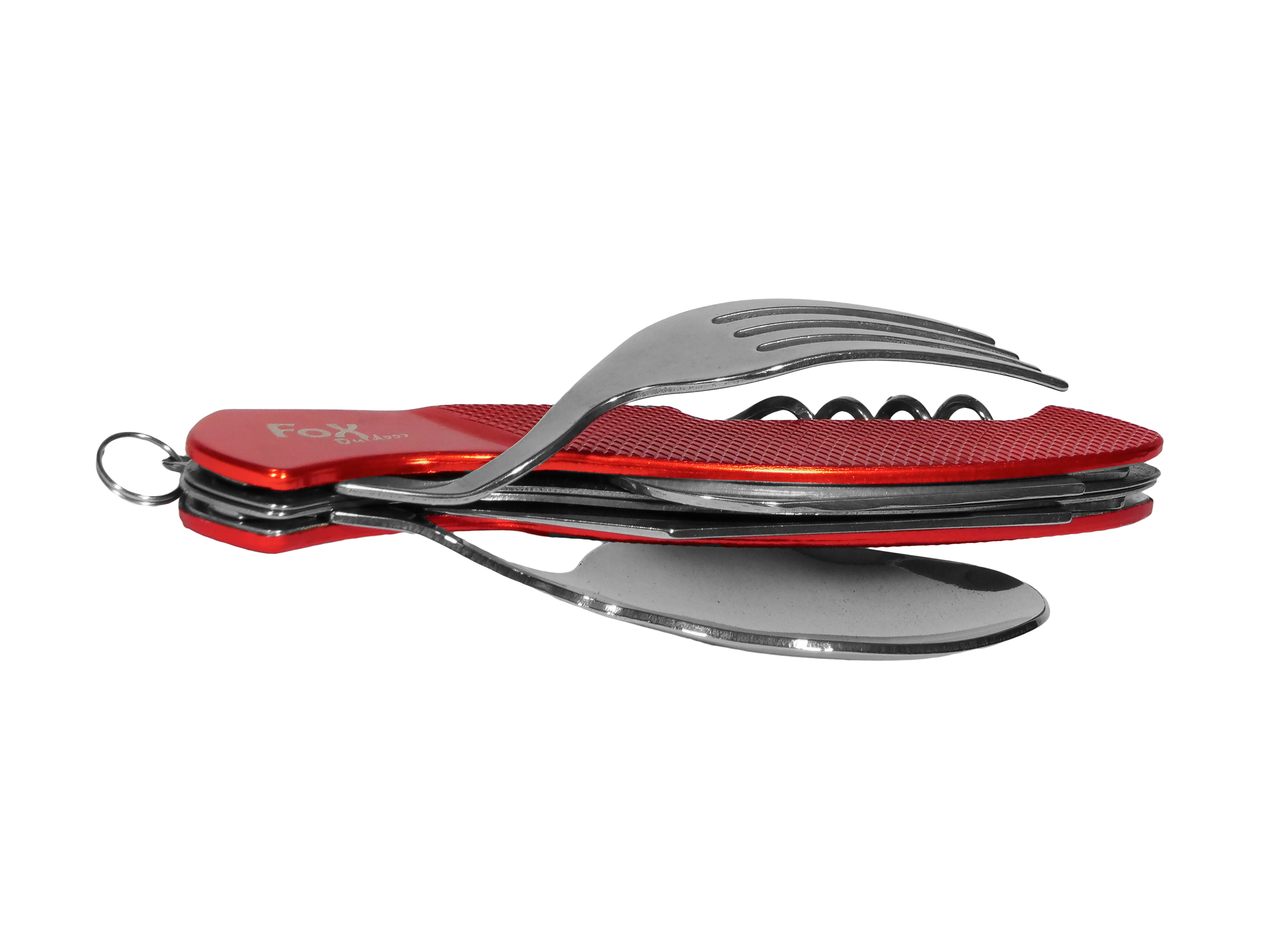 Niezbędnik Fox Outdoor swoją składaną konstrukcją nawiązuje do klasycznego scyzoryka, z tą jednak różnicą, że w niezbędniku oprócz podstawowych narzędzi (otwieracz do puszek i butelek, korkociąg, rozwiertak) znajdują się pełnowymiarowe sztućce tj. łyżka, widelec i nóż. Dodatkowo niezbędnik można w prosty i szybko sposób rozdzielić na dwie części, otrzymując w ten sposób osobny widelec i nóż z łyżką. W tym celu wystarczy rozłożyć otwieracz, pełniący rolę wewnętrznej blokady i rozsunąć niezbędnik wzdłuż własnej osi, Narzędzia oraz sztućce wykonano z polerowanej stali nierdzewnej. Antypoślizgowe, okładziny o wyrazistej kolorystyce, powstały z lotniczego aluminium poddanego procesowi anodowania, co zwiększa odporność na zarysowania i wytarcia.